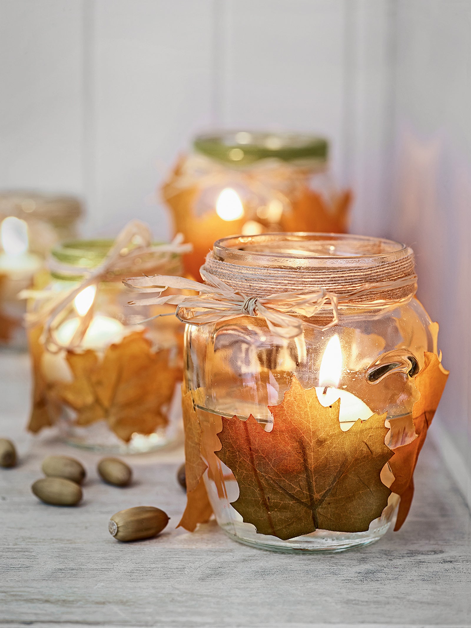 Välj glasburkar i lämplig storlek – till exempel sådana som används för hantverksmässigt tillverkade sylt och geléer. Täck burkarna med ett lager decoupagelim och placera sedan bladen i ett mönster runt burken efter eget huvud.