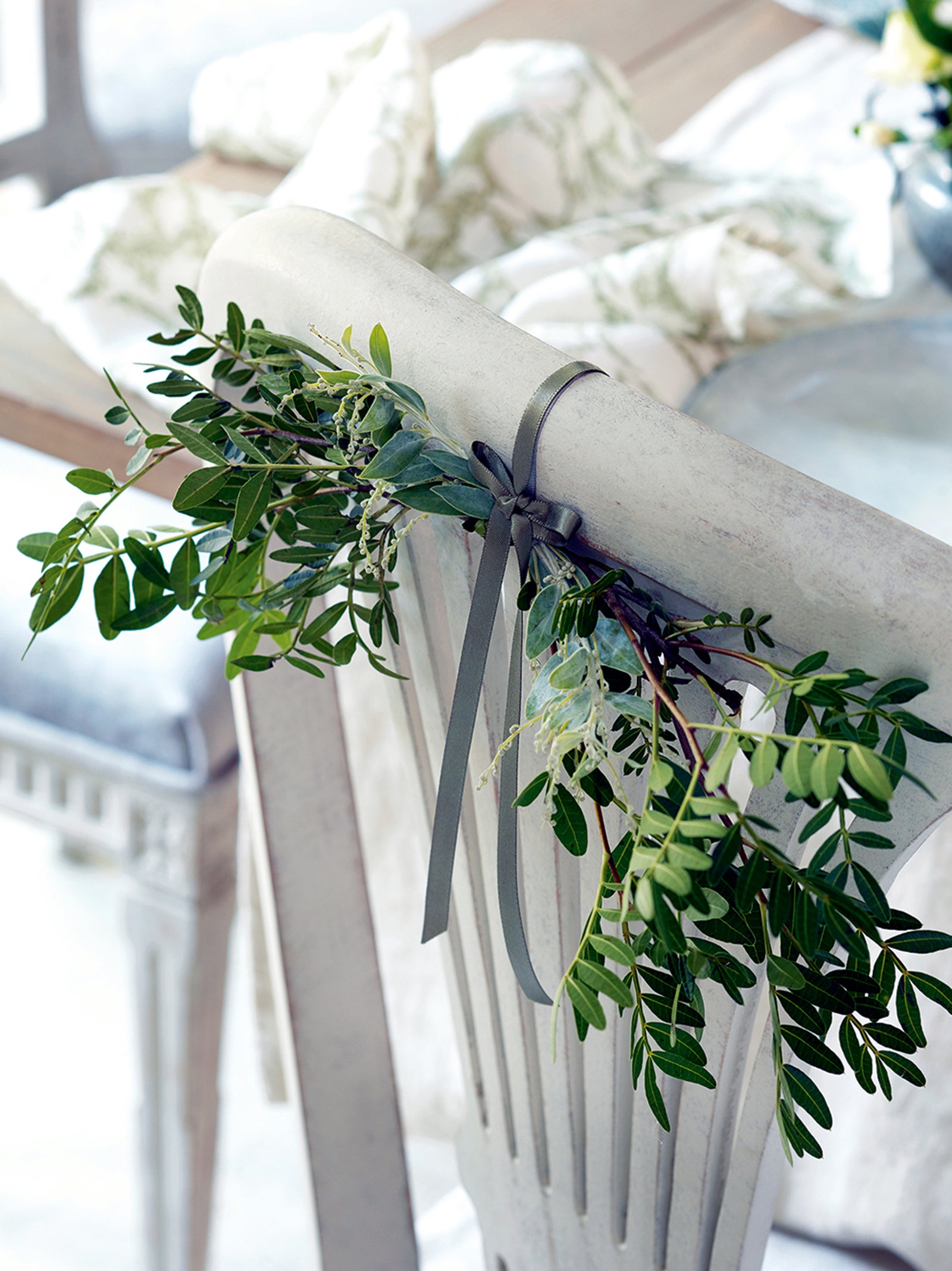 Dela en bukett bladverk på mitten och korsa stjälkarna lite i botten så att de avskurna ändarna döljs bland bladen. Enkla gröna bladverk ser mycket eleganta ut, men för en mer lantlig känsla kan du lägga till kvistar med bär.