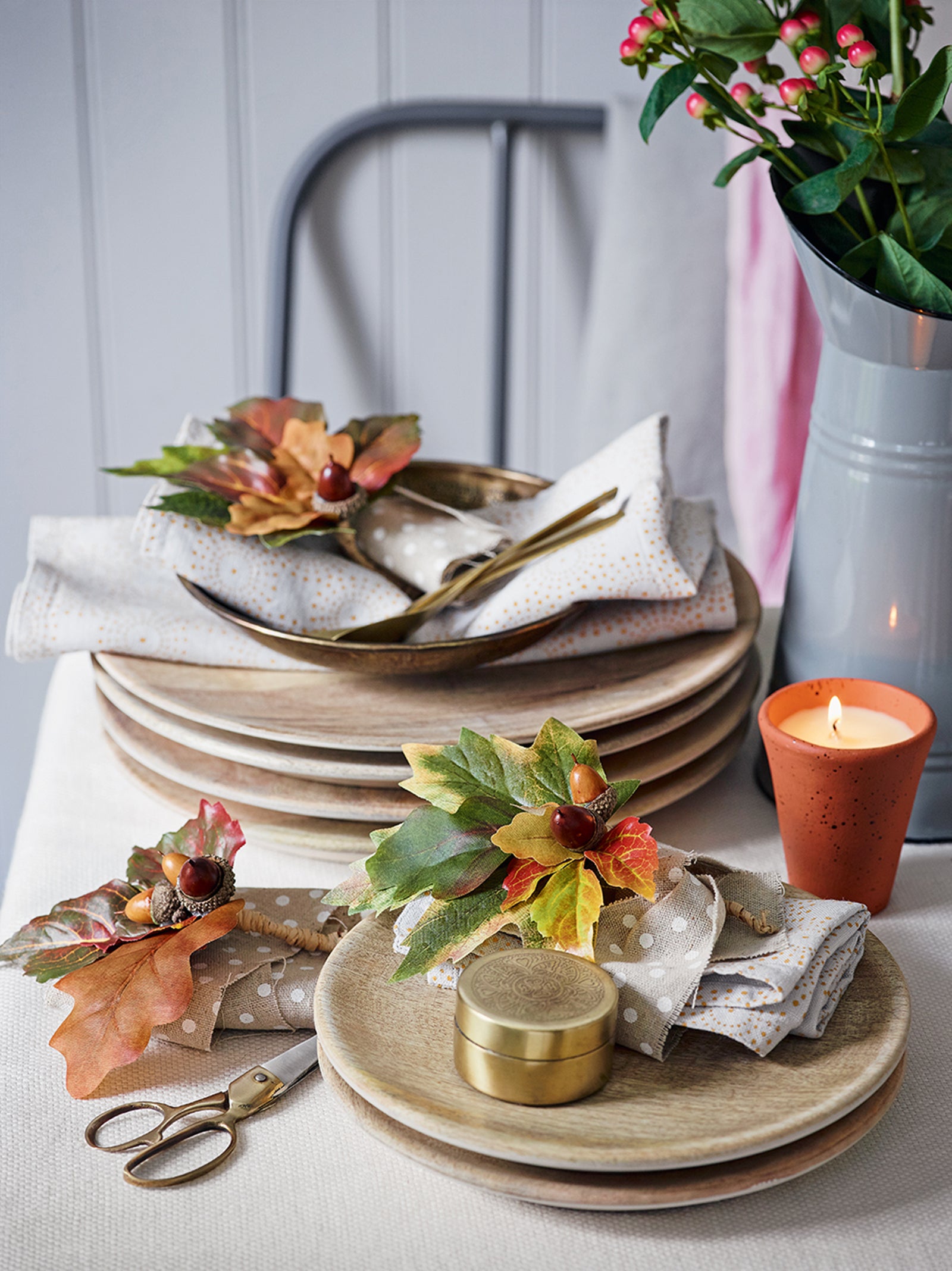 Dessa dekorationer av lövverk och ekollon ser fantastiska ut när de knyts fast på servetter eller presenter, eller kan arrangeras i en liten burk.