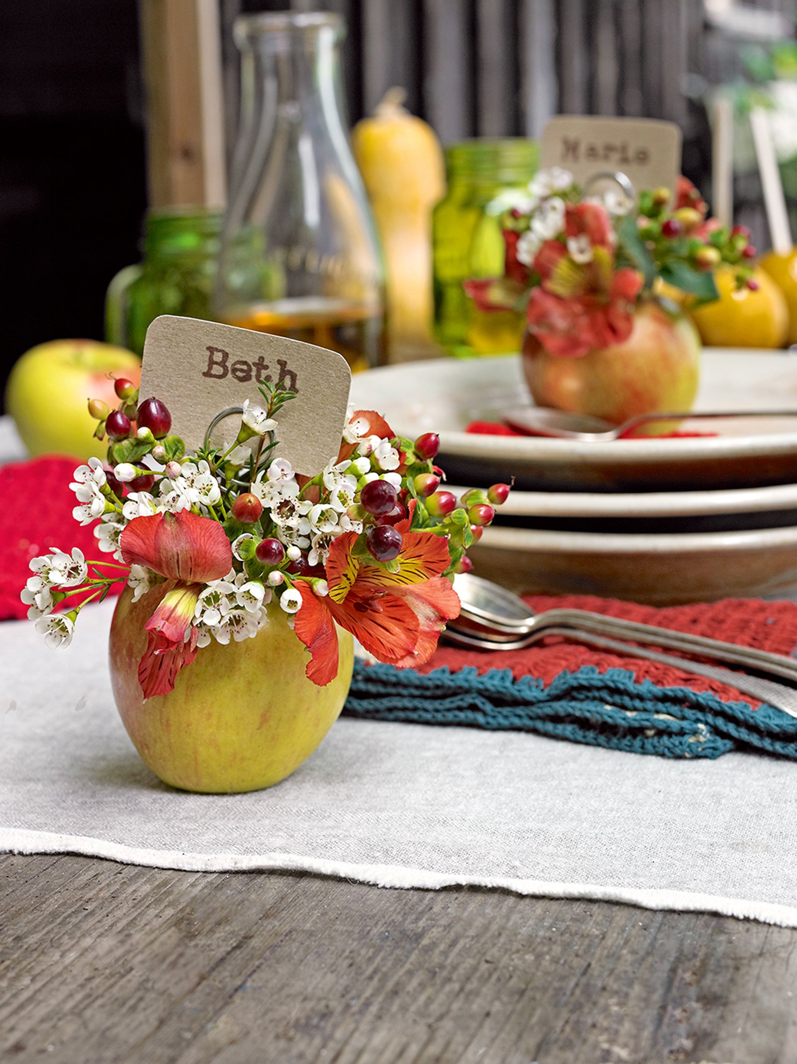 Dessa placeringskortshållare sprudlar av höstfärger och är så lätta att göra med hjälp av hemmaodlade äpplen. På grund av sin lilla storlek passar de bäst med mer delikata blommor som annars skulle försvinna i en större centerpiece.