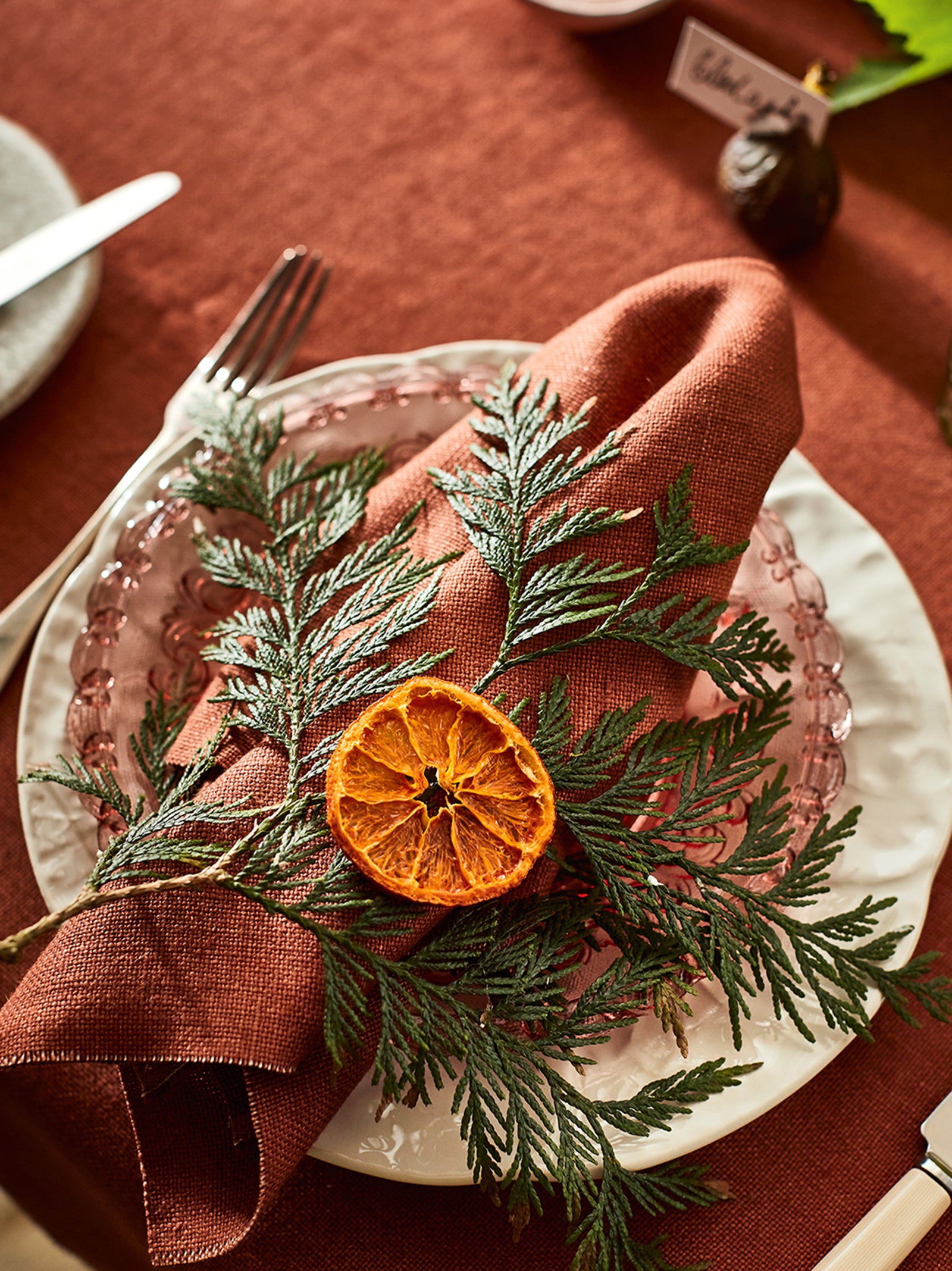 För att få rätt look, lägg en vacker kvist från trädgården över en vikt eller rullad servett. Om du vill kan du förstärka den rustika känslan genom att använda ett stycke jutesnöre för att fästa den på plats.