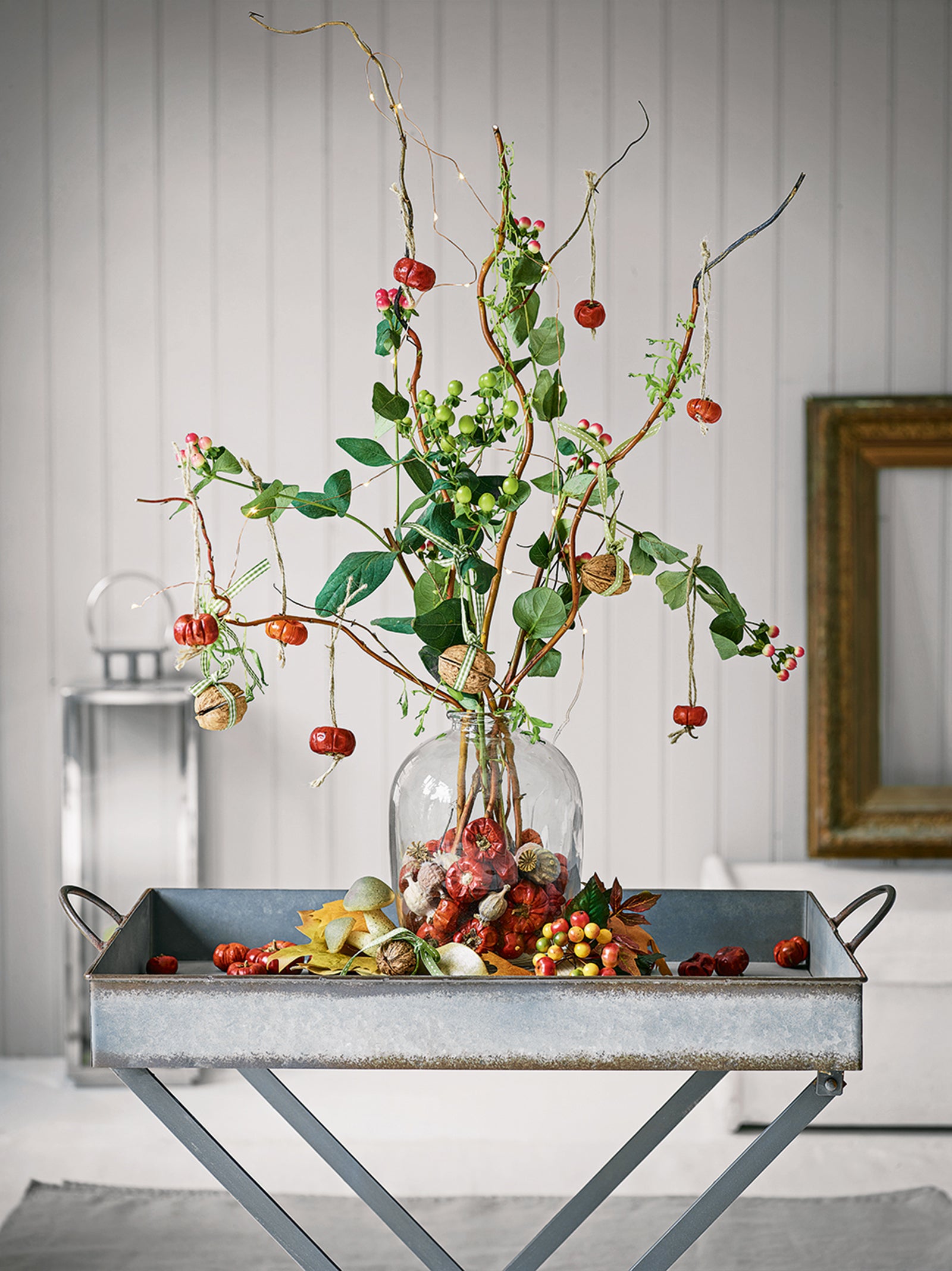 Samla frodigt lövverk, färgglada bär, säsongens blommor, fröskidor, nötter, frukt och grönsaker från din trädgård – eller plocka dem under höstpromenader.