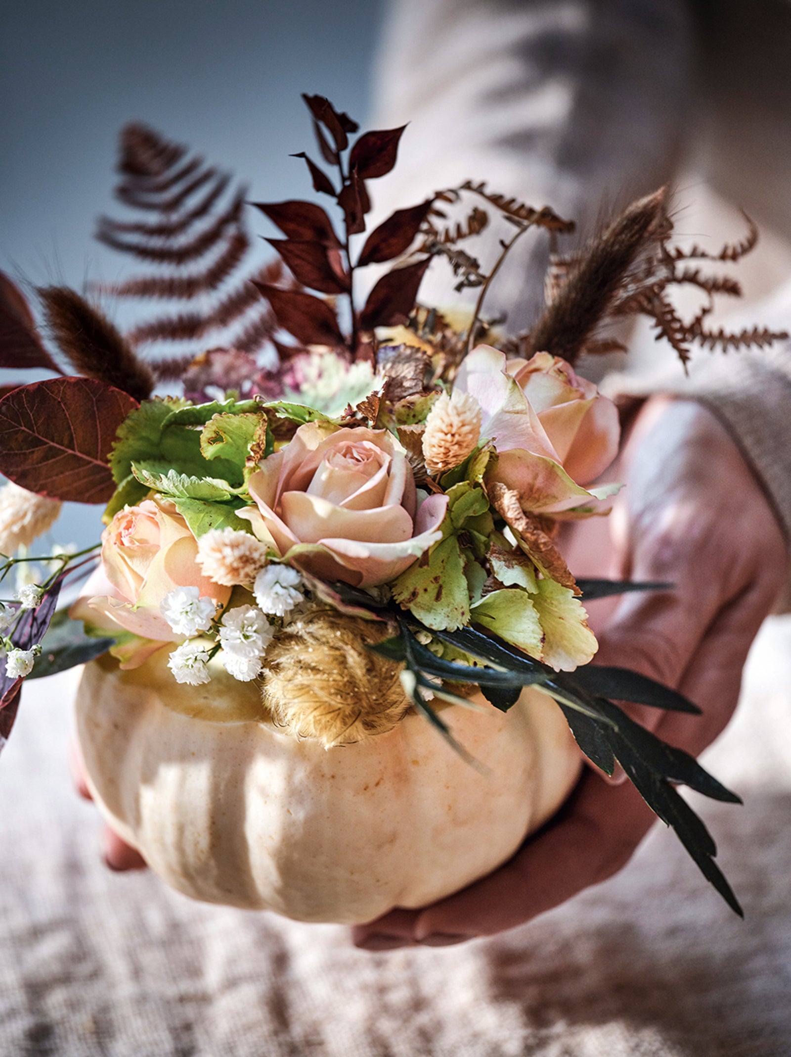 Pumpor och squash är charmiga kärl att visa upp blommor i. En stor hemmagjord pumpa som mittpunkt eller tre mindre kalebasser är den perfekta dekorationen för thanksgivingbordet – och du kan komplettera scenen genom att placera en minipumpa på varje tallrik.