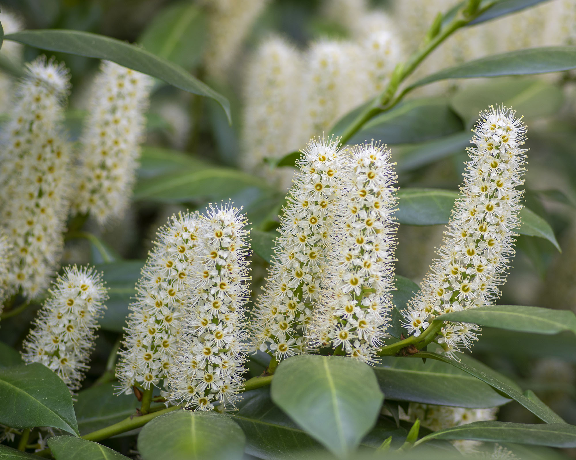 Körsbärslaurel (Prunus laurocerasus), eller engelsk laurel, är hemma i södra Europa och sydvästra Asien. Det är en tät vintergrön buske som ger bra skydd året runt i USDA-zonerna 6 till 8 och blir upp till 5,4 meter hög.