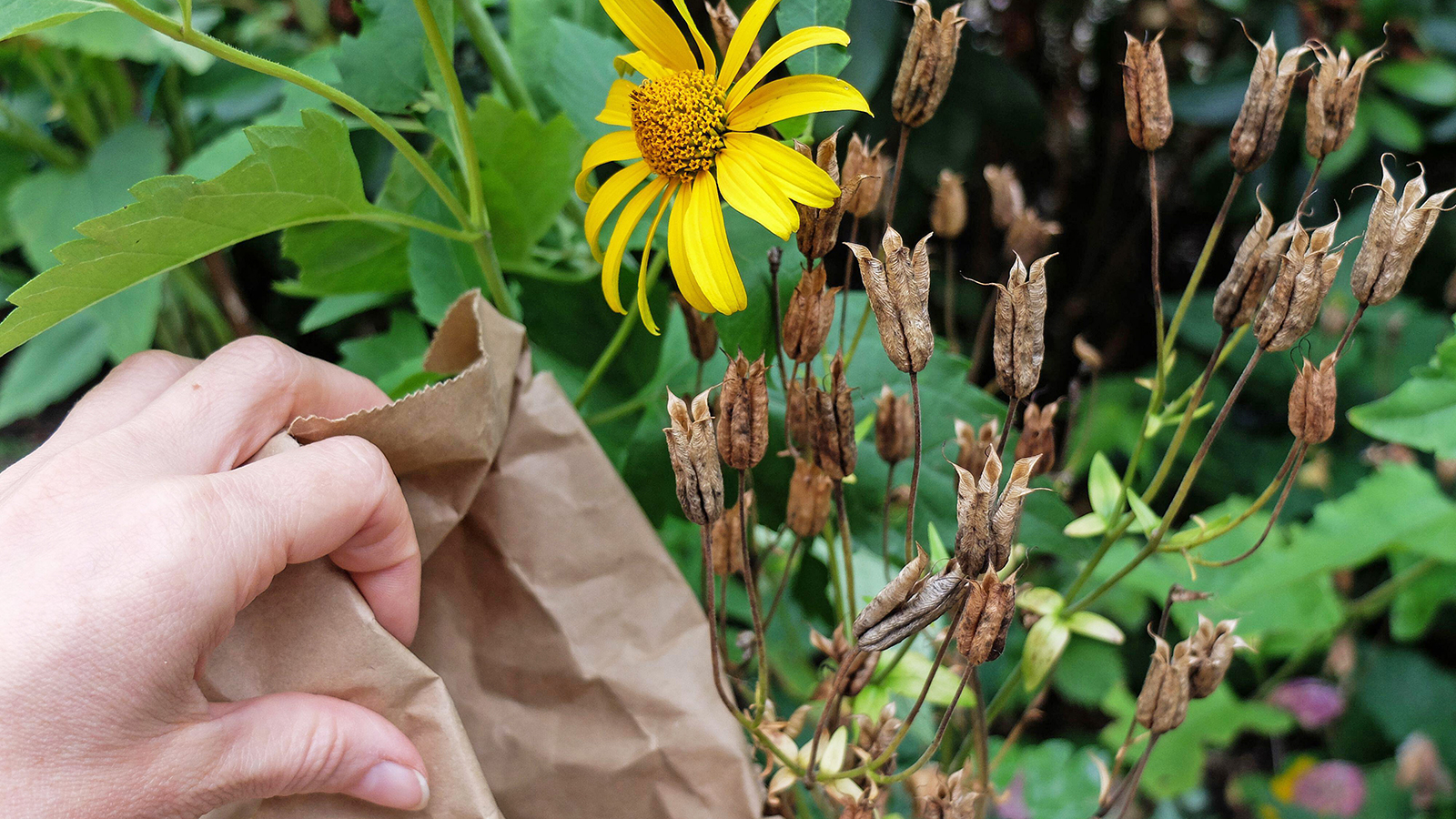 För att skydda de växande fröna från vilda djur, täck de utblommade blommorna med papperspåsar eller ta bort dem tidigt och häng dem inomhus för att torka.