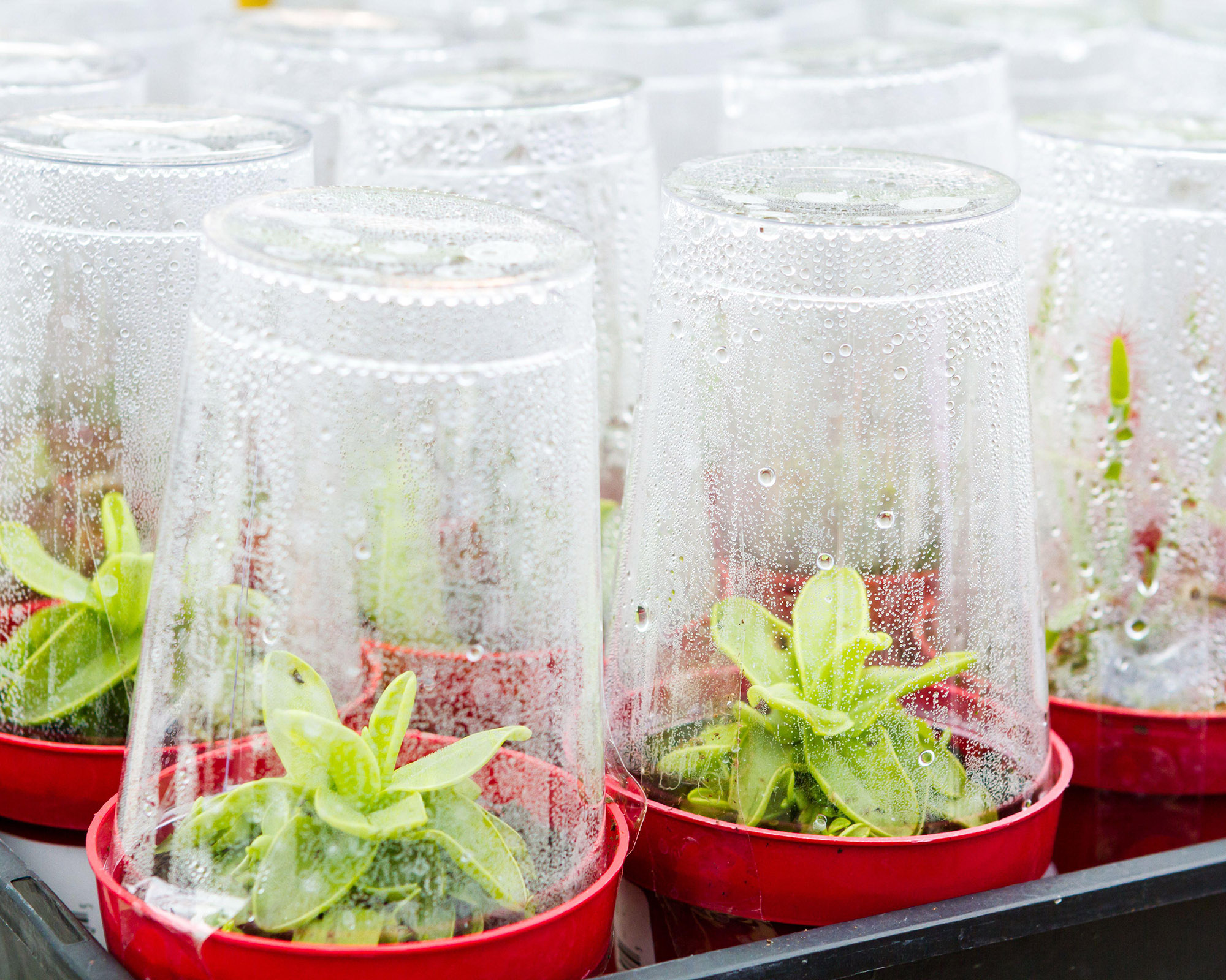 Placera helt enkelt en behållare över en sålåda eller en liten kruka eller behållare för att skapa ett snabbt växthus för en enda planta. Plasten räcker för att hålla små, ömtåliga plantor varma och fuktiga i kallare väder.