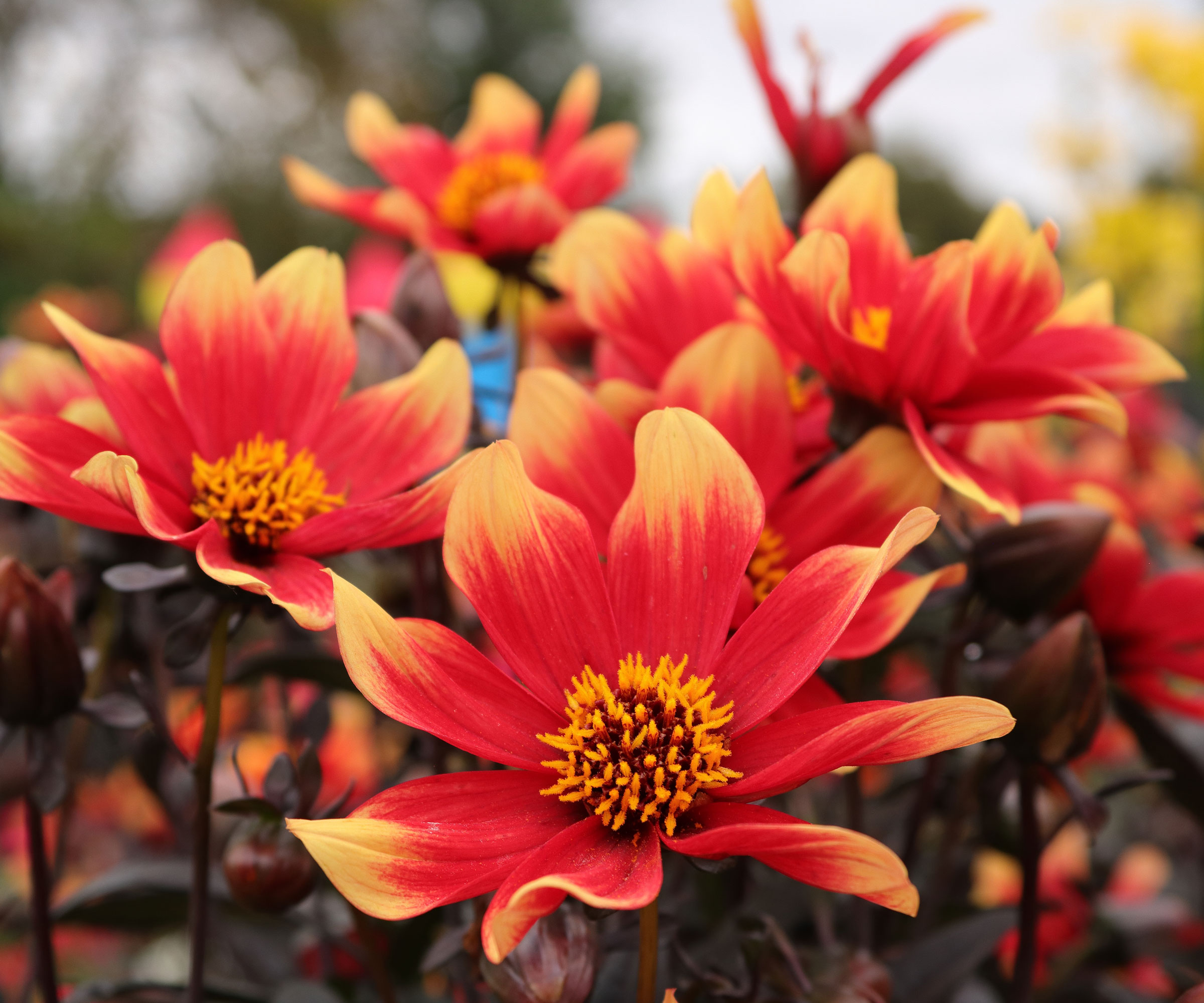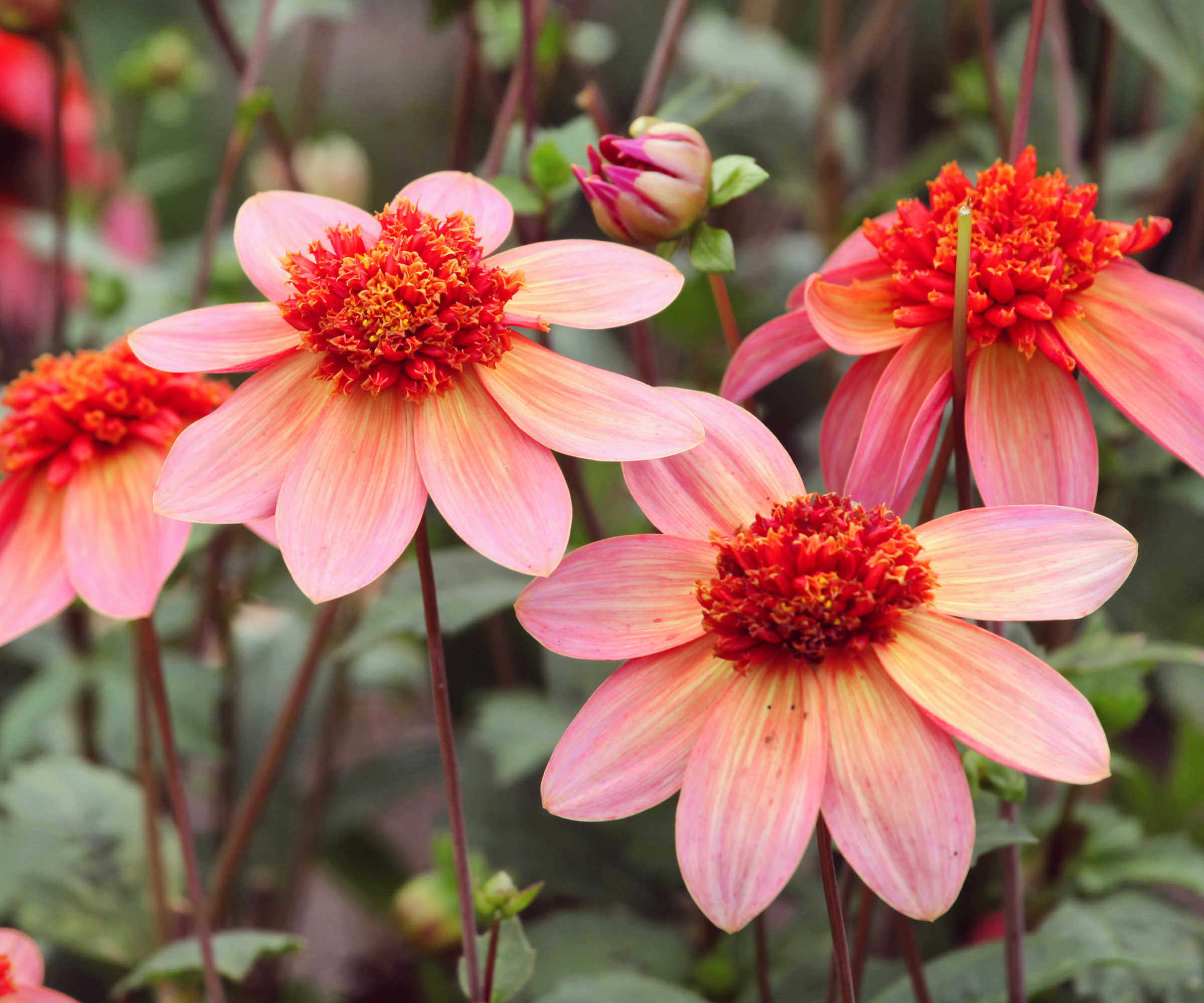 Dahlior av sorten ”Bishop of Llandaff” är kända för sitt vackra purpurfärgade bladverk och passar särskilt bra för odling i krukor. De lysande röda blommorna slår ut i stort antal och lockar till sig kolibrier och nyttiga insekter.