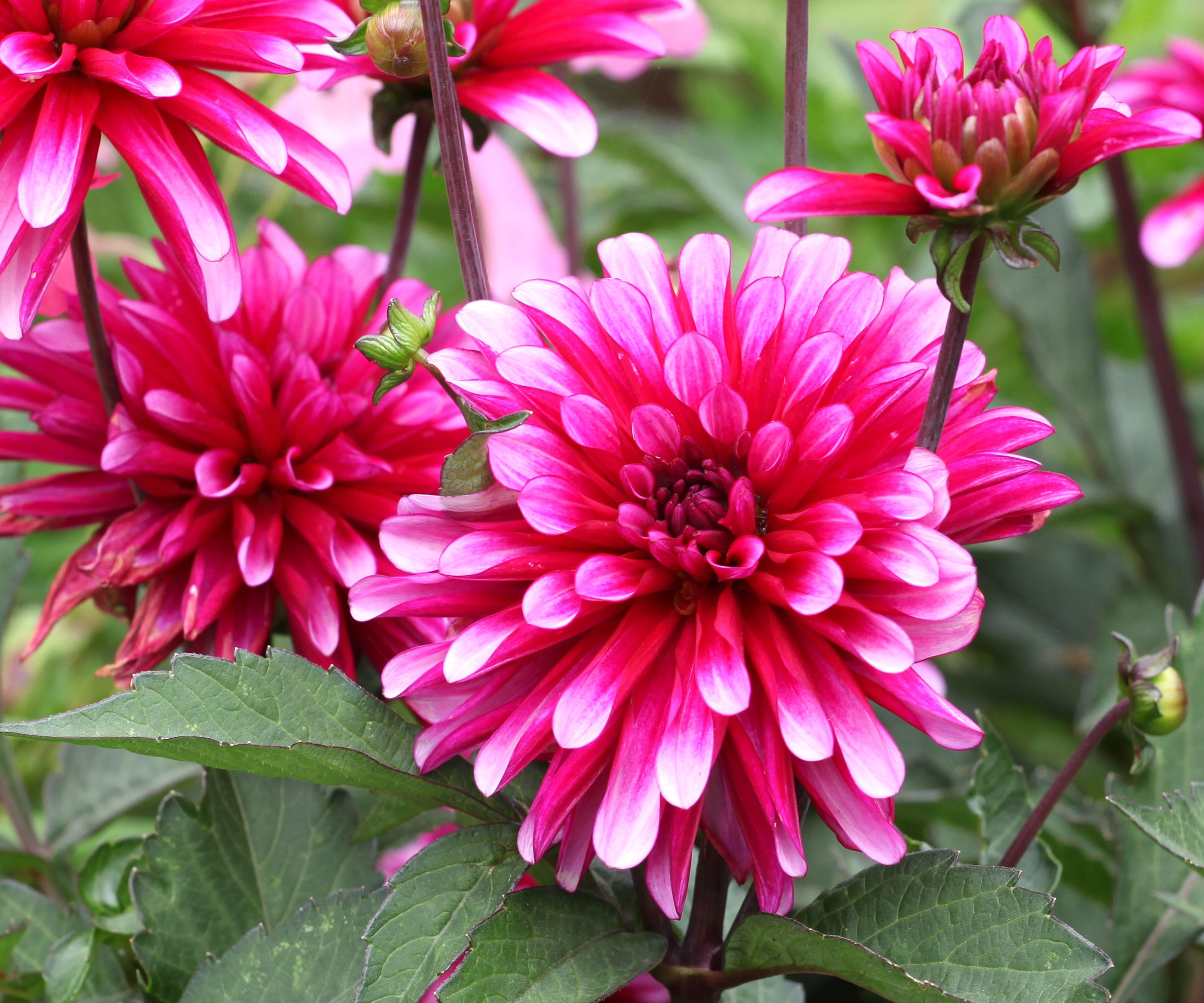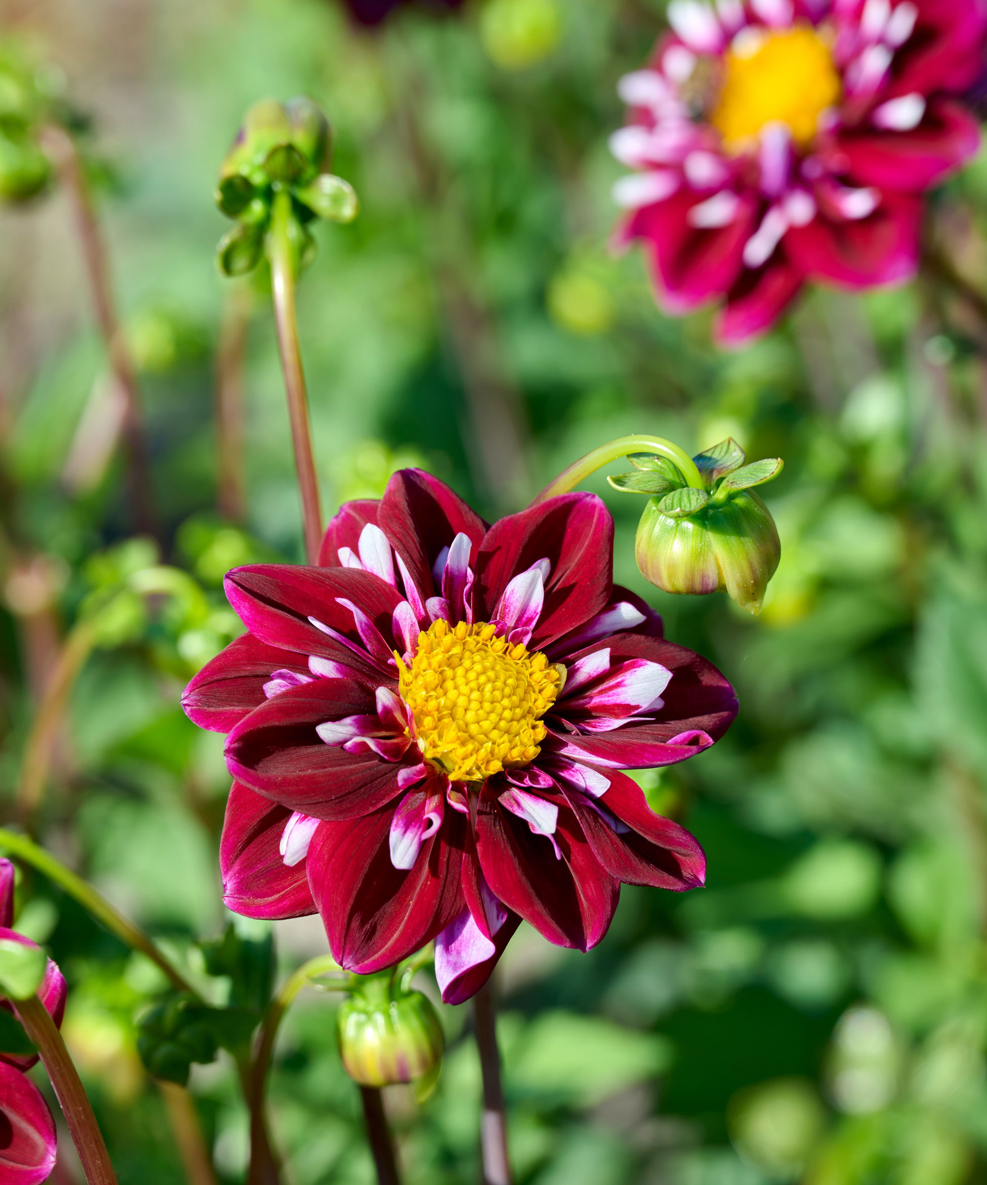 Dahlior av sorten ’Karma Sangria’ är uppskattade för sin ljusa rosa och gula tvåfärgade färg och sin distinkta kaktusform. Blomningen fortsätter hela sommaren och upphör först när temperaturen sjunker.