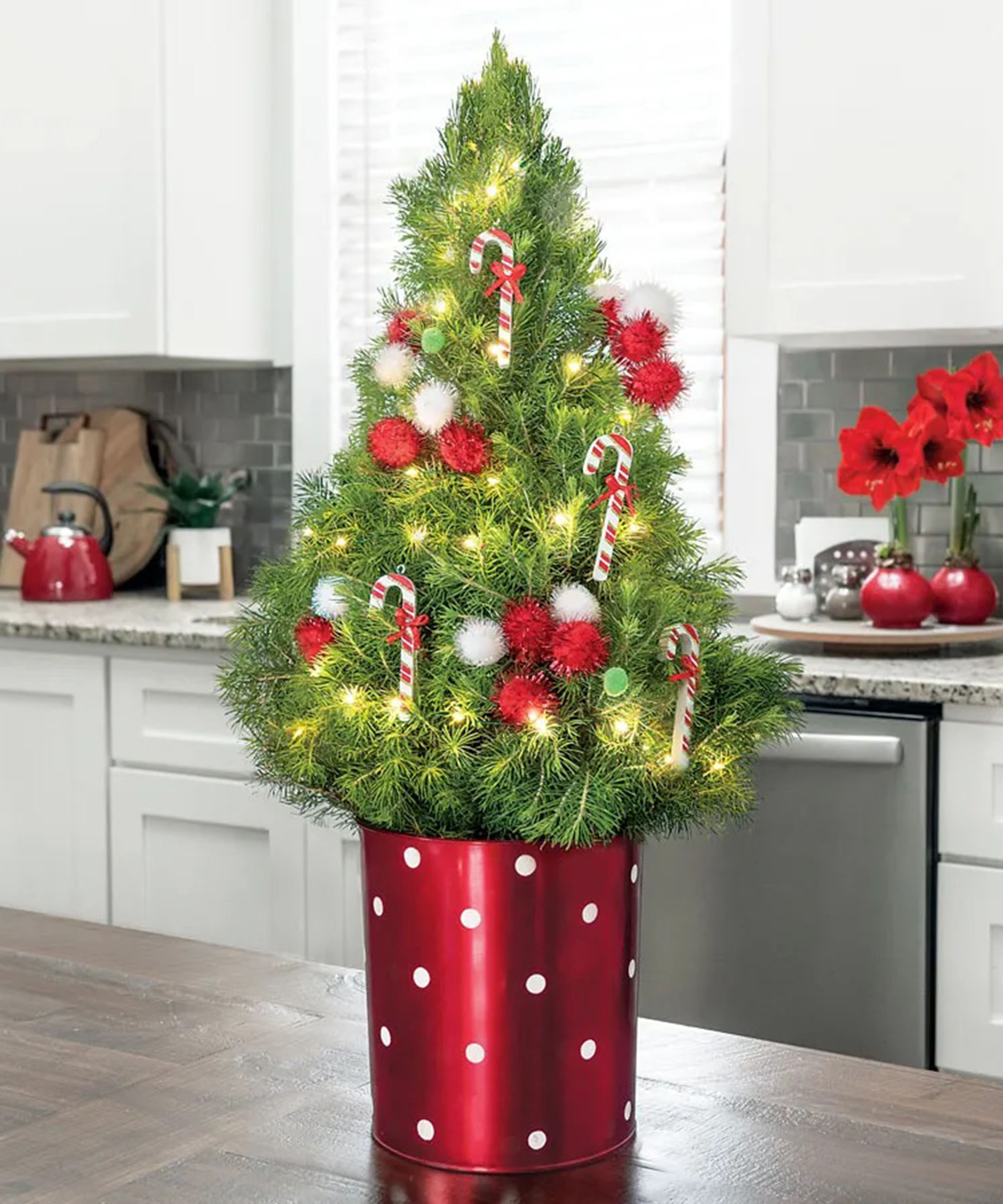 Denna julgran med dekoration i form av polkagrisar från Jackson & Perkins är fullt utrustad med julpynt och levereras i en stilfull behållare med röda och vita prickar.