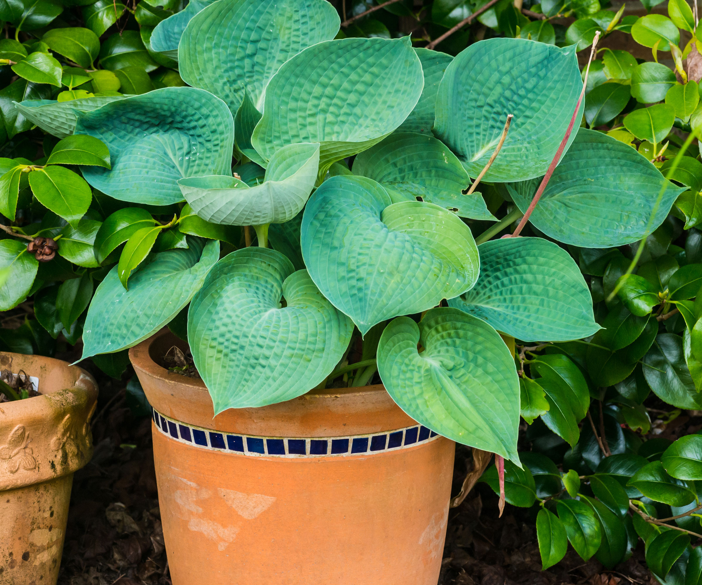 Precis som coleus är hostor (Hosta spp.) uppskattade för sitt bladverk och tål skugga. Man skulle kunna tro att deras betydande tillväxtpotential gör dem svårhanterliga i krukor, men faktum är att de växer bra i behållare. Välj bara en stor kruka som ger plantan gott om utrymme och tillräcklig dränering. Krukor av lera, terrakotta eller sten hjälper till att hålla rotsystemet svalt.