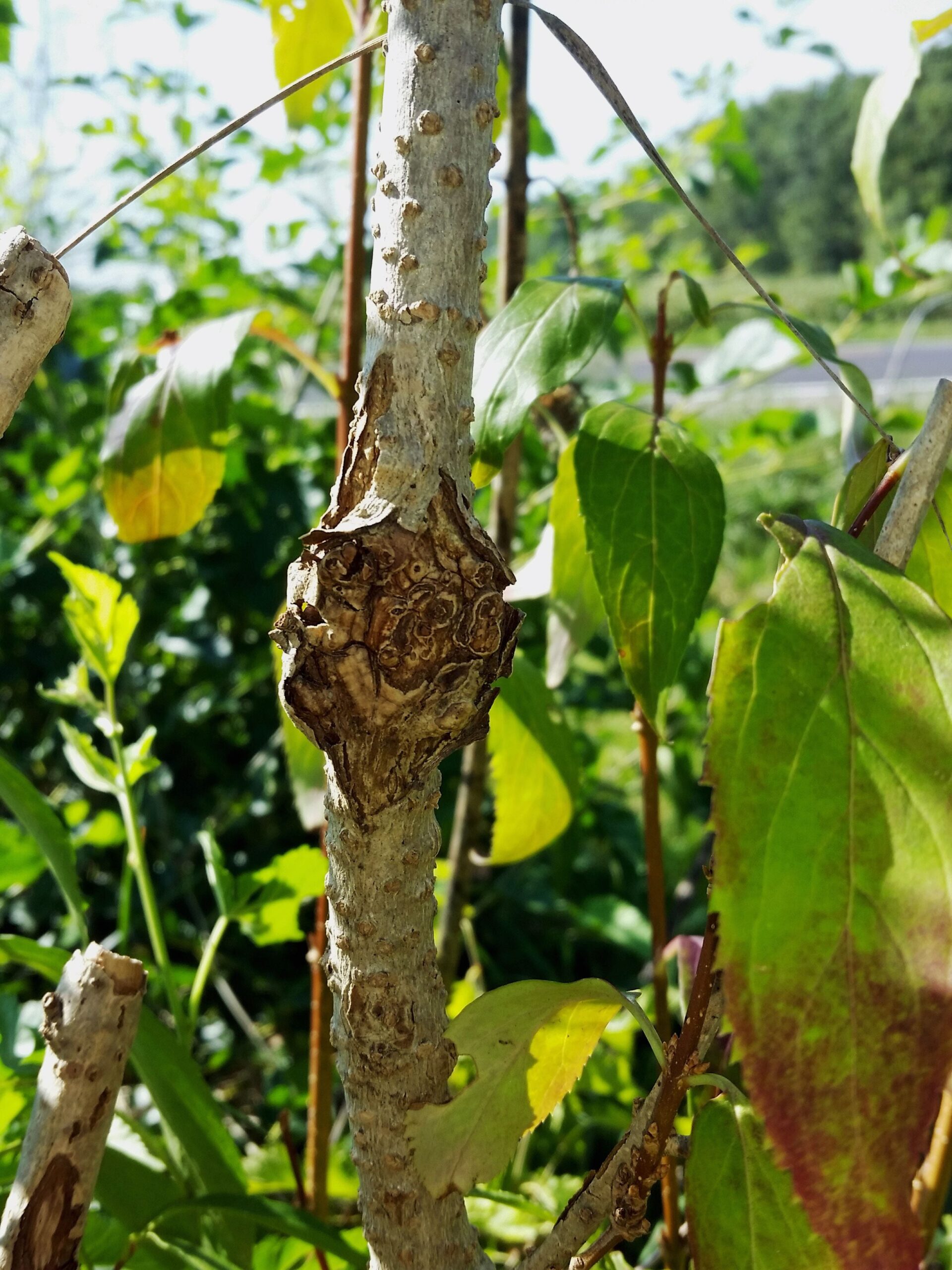 Forsythias ljusgula blommor är ett tecken på att våren är på väg, men när buskarna får ovanliga svullnader på grenarna är det knappast en glad start på säsongen. Gallbildning är inte ett ovanligt problem för träiga växter och träd, men till skillnad från de vanligaste gallbildningarna orsakas forsythia phomopsis gall av en aggressiv svamp. Svampen Phomopsis spp. är ansvarig för de oregelbundna svullnaderna som uppstår på drabbade forsythia-buskar. Dessa gall är vanligtvis 2,5–5 cm i diameter, märkbart runda och har en grov, ojämn struktur. Det är lätt att förväxla dem med gall som orsakas av insekter eller kvalster, men det är nödvändigt att skära i dem för att ställa en korrekt diagnos. När du skär igenom en phomopsis-gall är den helt solid, till skillnad från andra gall som innehåller kamrar eller har tecken på borrningar inuti. Den initiala infektionen inträffar när svampsporer landar på nyligen skadad forsythia under vått väder. Det finns vissa bevis för att dessa sporer också kan spridas mellan växter på smutsiga verktyg. Om du har en forsythia som visar tecken på gallbildning, se till att du steriliserar dina beskärningsverktyg mellan snitten i en lösning av blekmedel och vatten, blandat i förhållandet 1:10. Till skillnad från insektsgaller är det ett stort misstag att ignorera phomopsis-galler – de kan lätt döda delar av svaga forsythia, vilket leder till allmän nedgång och död.