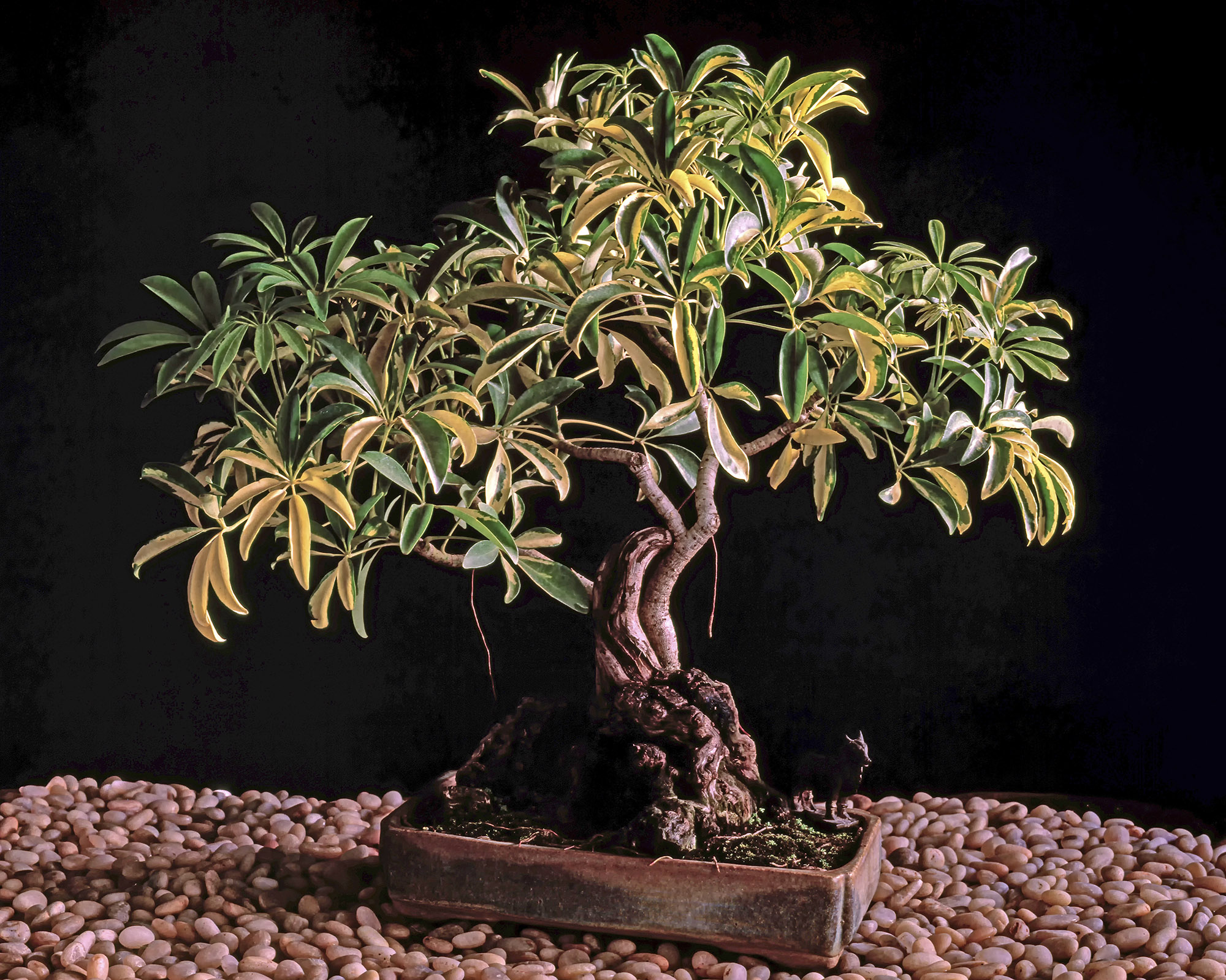 Detta är en tålig, nybörjarvänlig bonsai som passar särskilt bra i inomhusmiljöer. Schefflera, även känd som paraplyträdet, trivs i starkt men filtrerat ljus och anpassar sig lätt till normal luftfuktighet i hemmet.