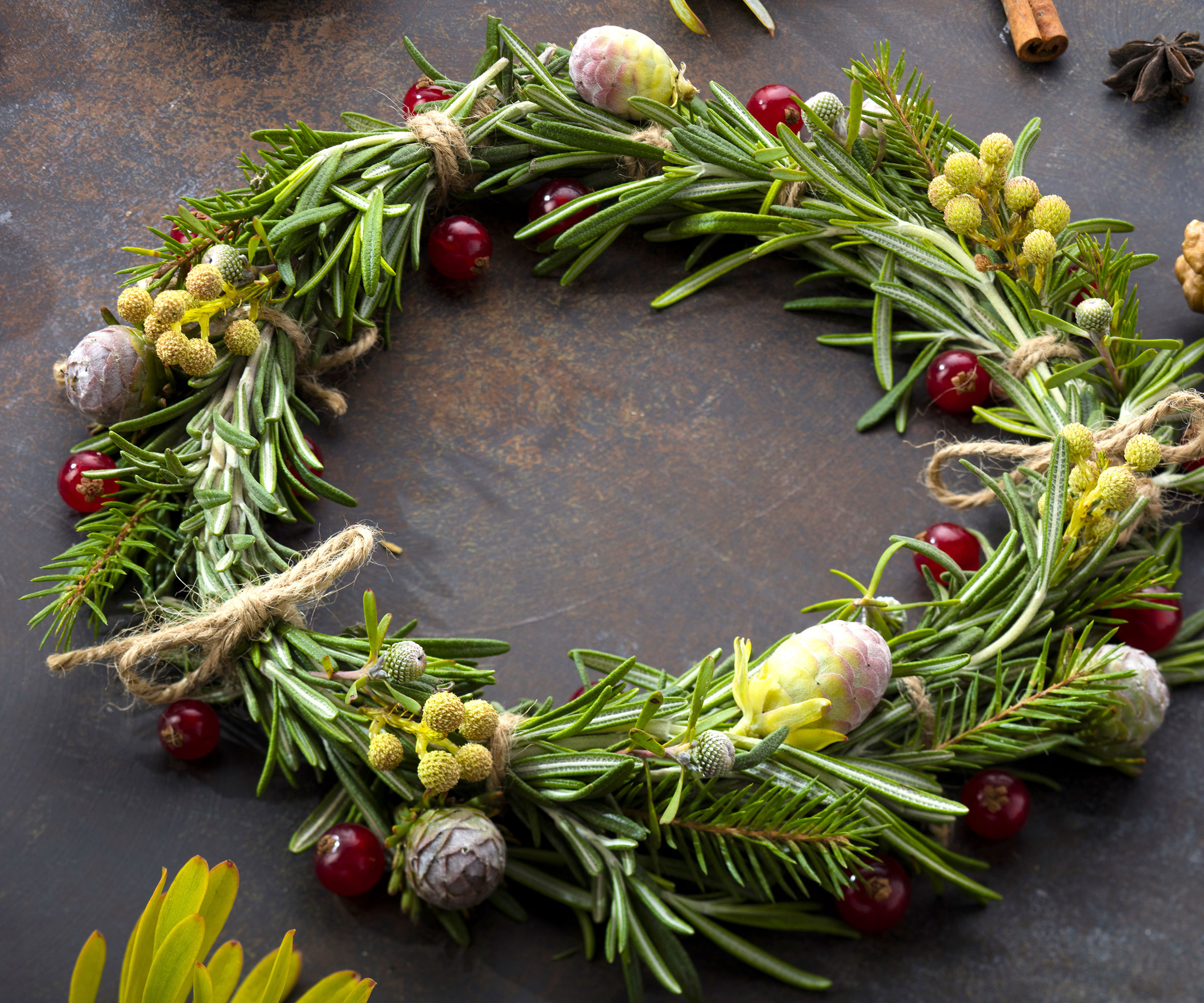 Ha ett gäng örtkrukor nära dörren så att du kan klippa av färska kvistar till rostade grönsaker, fyllning, garnering eller julskinkan. Dessa örter kan också fungera som dekoration – bind ihop små knippen med snöre eller använd kvistar som servettringar eller kransdekorationer.