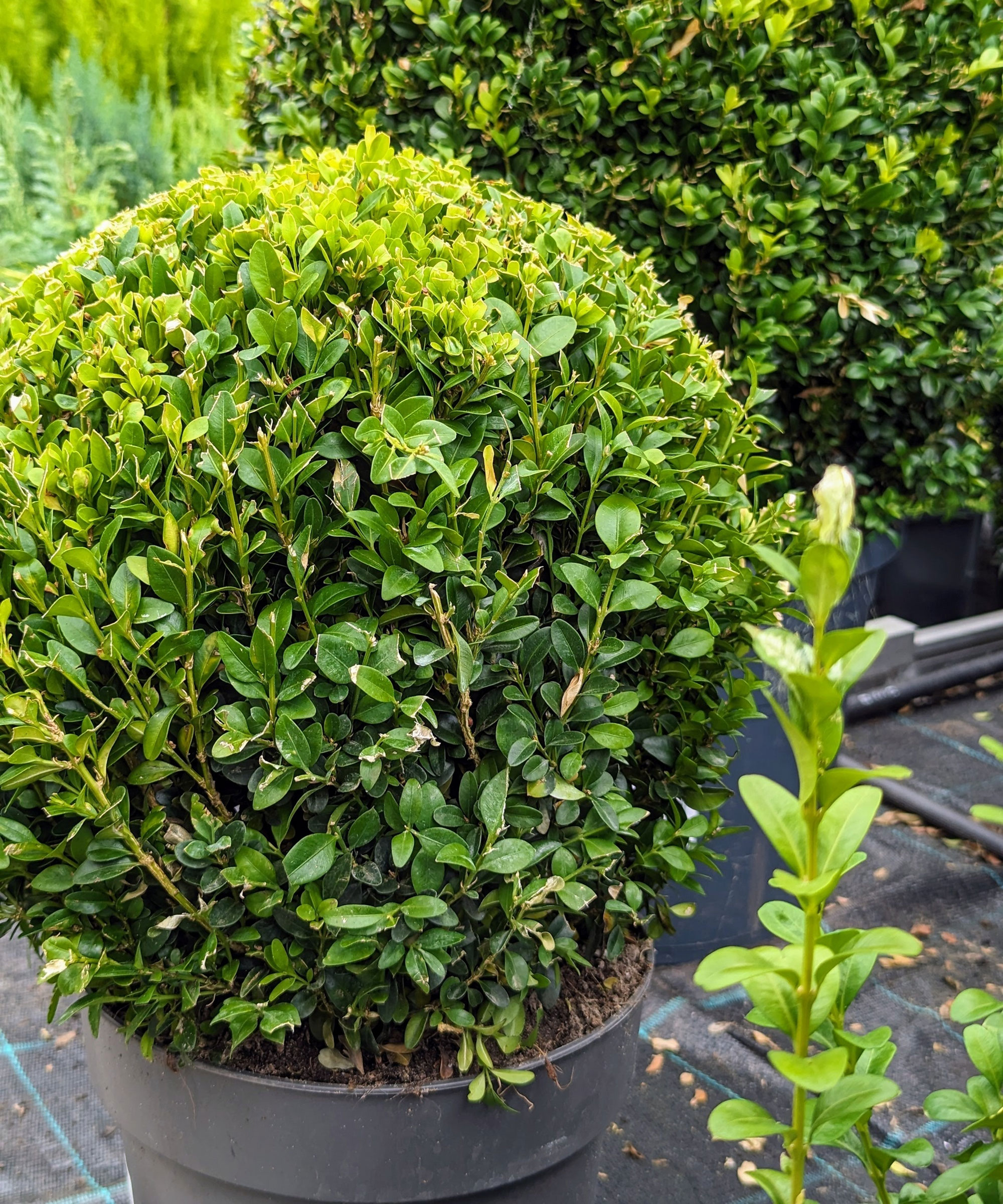Du kan hitta skimmia, dvärgbarrträd och andra krukväxtvänliga buskar i stora butiker som Walmart, som säljer denna fempack med buxbom.