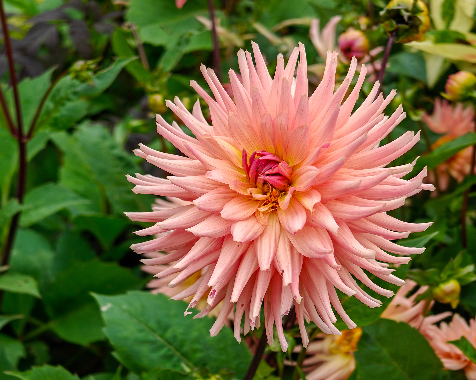 Detta är ett exempel på en anemonliknande dahlia som producerar rikligt under hela säsongen. De yttre kronbladen är ljusrosa-lavendelfärgade, medan de krullade centrala kronbladen är djupare lila. Detta är en mindre dahliaväxt än andra på denna lista, så den passar bra i mindre utrymmen. ’Blue Bayou’ blir bara cirka 90 cm hög, men har många 10 cm stora blommor.