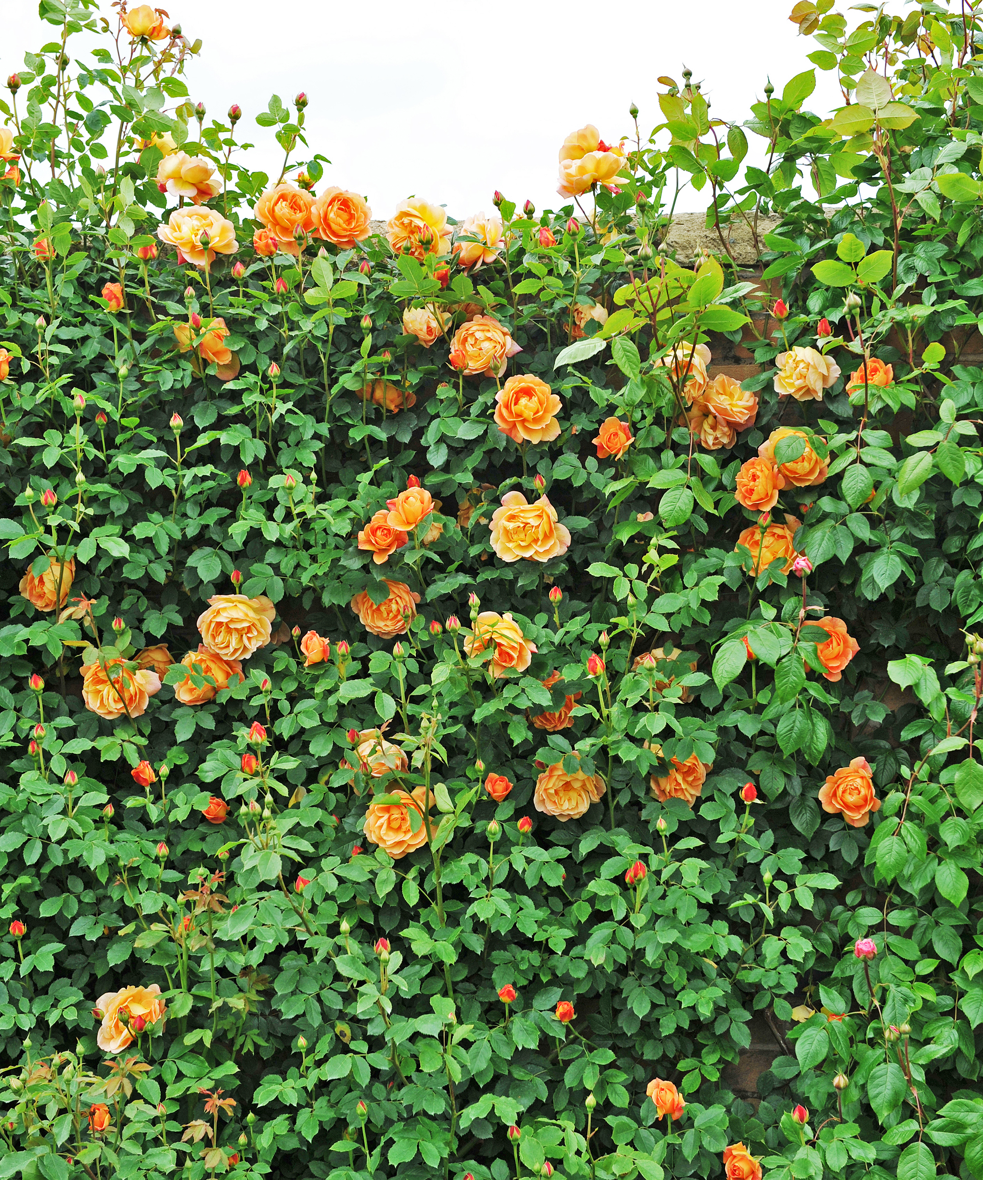 Wenn Sie eine Kletterrose mit wiederholter Blüte wünschen, aber nur wenig Platz haben, probieren Sie „Lady of Shalott”. Dies ist eine kleinere Sorte, die nur etwa 1,2 m hoch und breit wird. Die Blüten blühen während der gesamten Vegetationsperiode in einem auffälligen Lachs-Orange-Ton. Der Duft ist dezent, aber angenehm und erinnert an Gewürze.