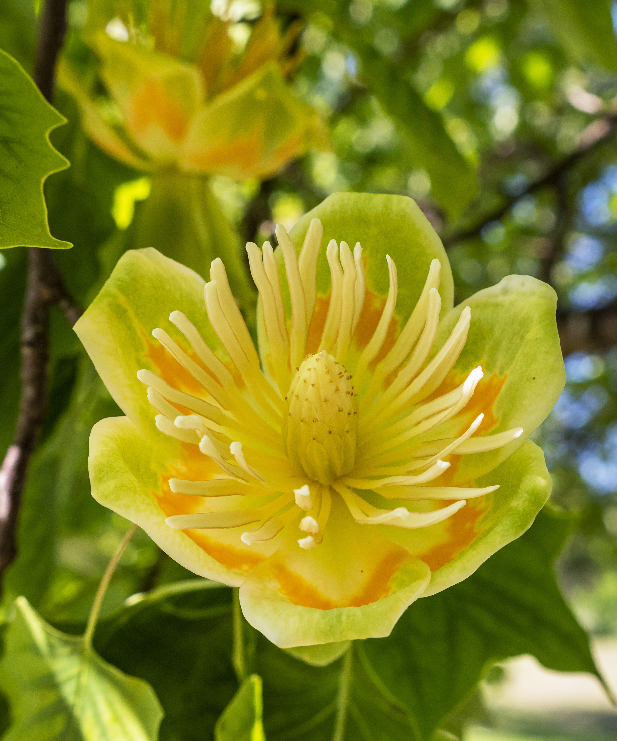 Tulpenbäume (Liriodendron tulipifera) besitzen die schönsten duftenden Frühlingsblüten, die den Tulpenblüten ähneln. Als Mitglied der Magnolienfamilie hat der Tulpenbaum eine elegante Form, ist jedoch nicht für jede Landschaft geeignet, da er eine Höhe von über 37 m erreichen kann.