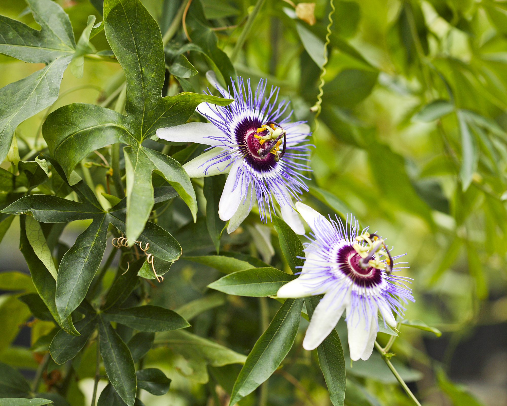 Verleihen Sie Ihrem Garten einen tropischen Touch und unterstützen Sie Schmetterlinge, indem Sie eine Passionsblume (Passiflora spp.) pflanzen.