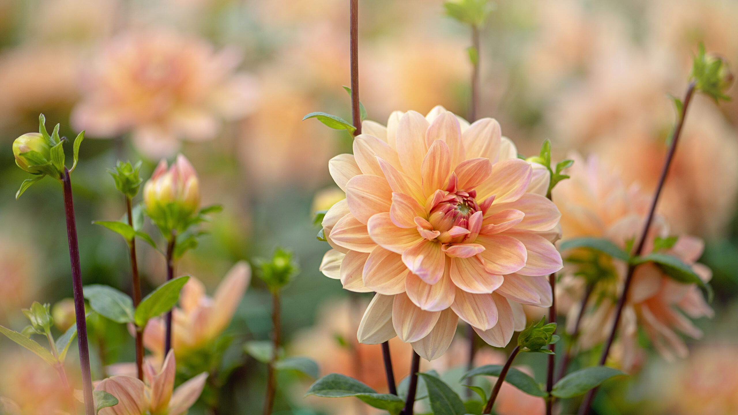 Dahlien gibt es in vielen zarten Pfirsichfarbtönen mit unterschiedlichen Blütenblattstrukturen, aber „Apricot Desiree” ist unsere Wahl, um Pantones „Peach Fuzz” in Ihren Garten zu bringen.