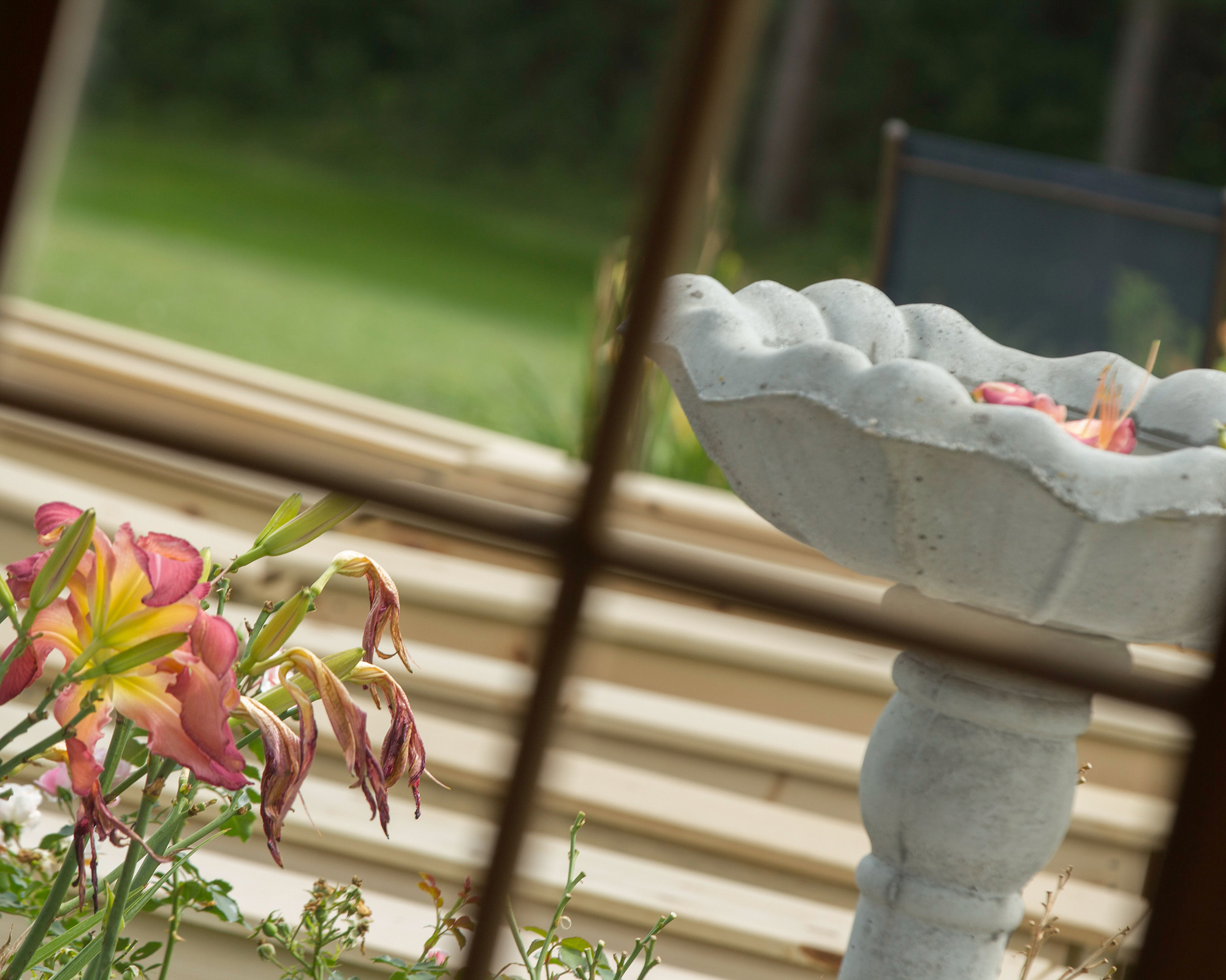 Natürlich ist es verlockend, Ihr Vogelbad direkt vor dem Fenster aufzustellen, damit Sie das Spektakel bequem von Ihrem Sessel aus genießen können. Allerdings könnten Ihre Bewegungen die Vögel erschrecken und dazu führen, dass sie hastig davonfliegen. Im besten Fall bedeutet dies, dass Sie die Vögel nicht aus der Nähe beobachten können; im schlimmsten Fall sehen sie das Glas Ihres Fensters nicht und fliegen bei ihrem Fluchtversuch direkt dagegen. Fensterkollisionen sind leider häufig und können tödlich enden.