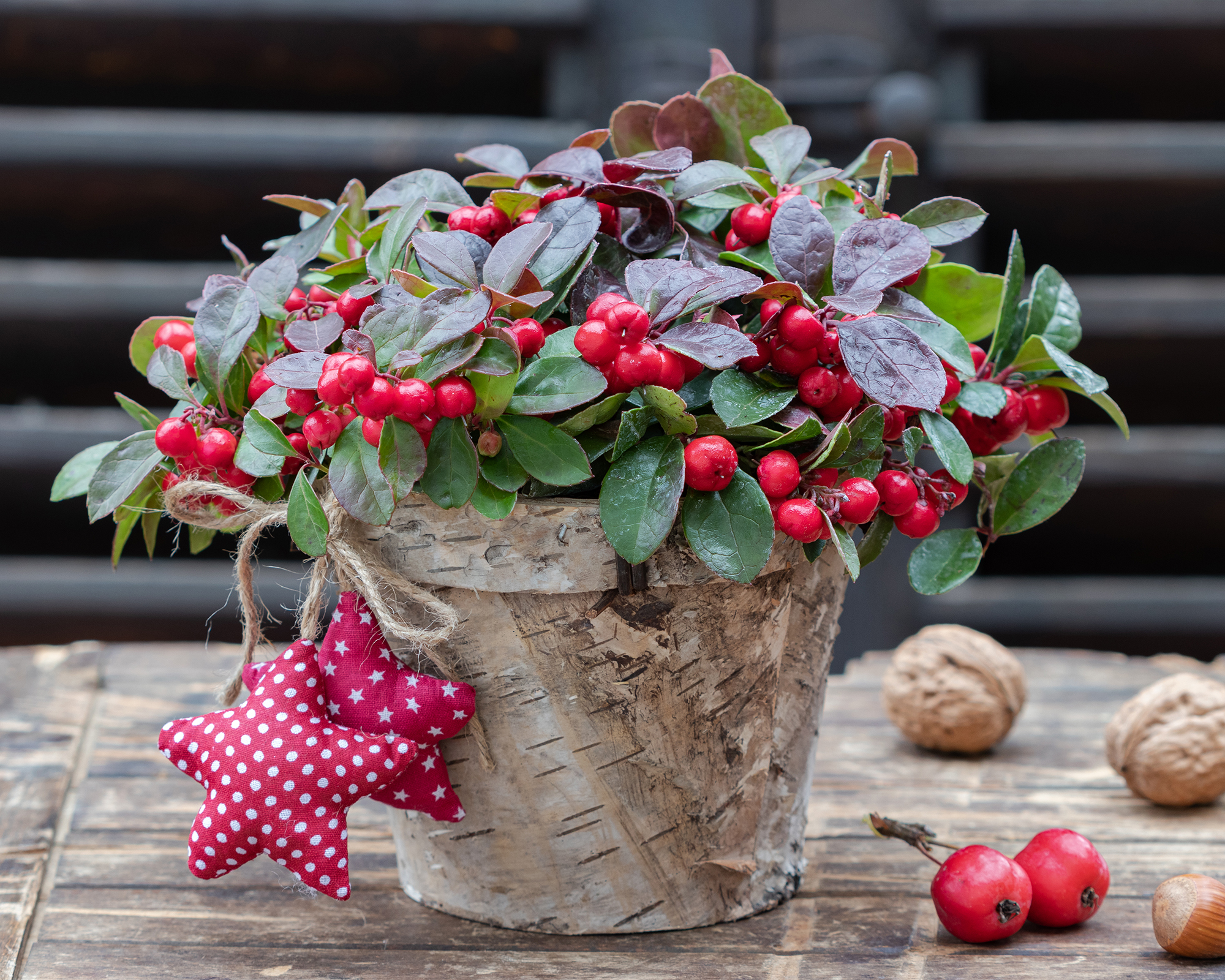 Der niedrig wachsende, immergrüne Strauch Weihnachts-Wintergrün (Gaultheria procumbens) wird oft als Bodendecker verwendet, sieht aber auch in einem Weihnachtsblumentopf auf der Veranda fantastisch aus. Da er nur langsam wächst, kann er mehrere Jahre lang im selben Topf bleiben.