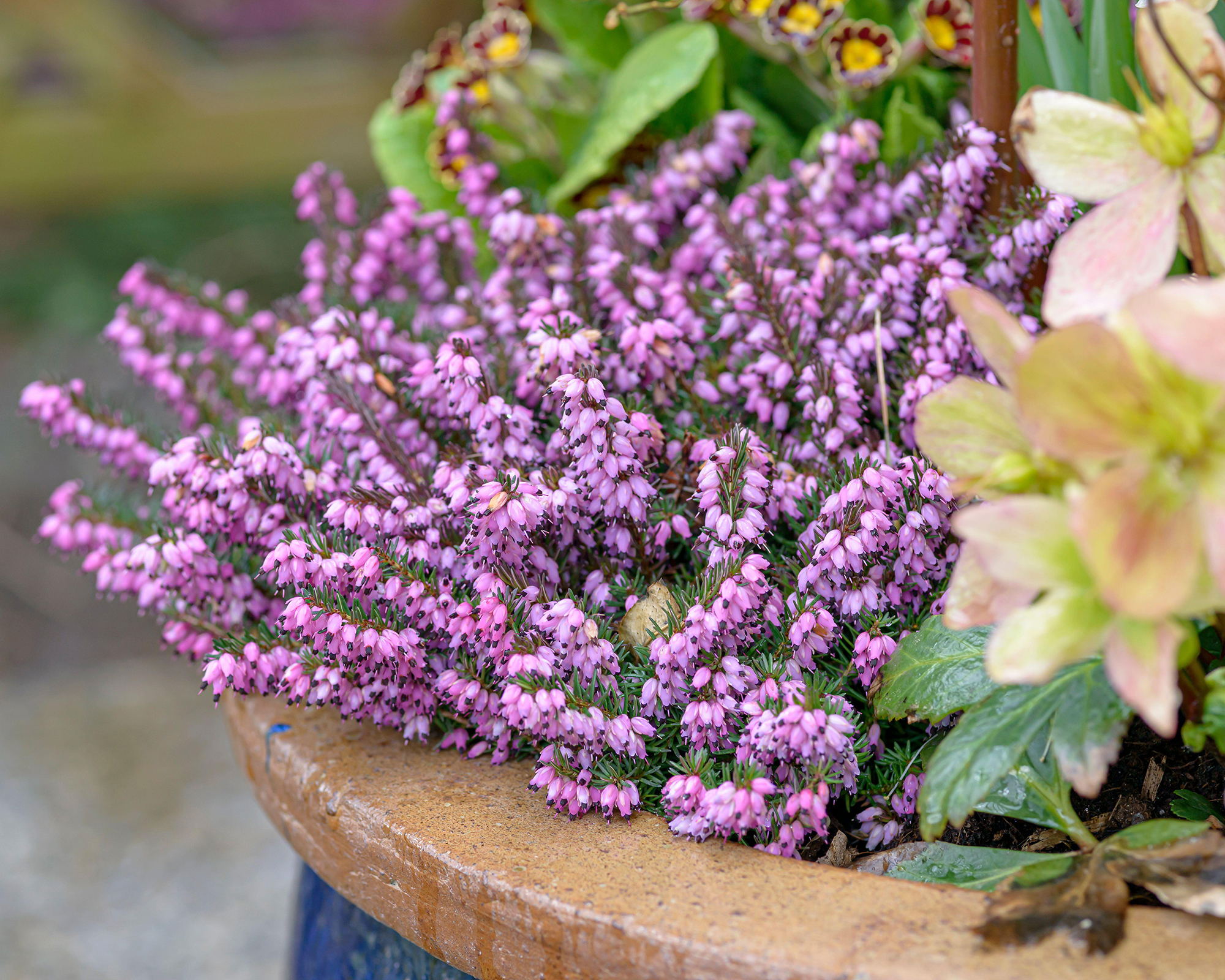 Winterheide (Erica carnea) ist ein niedrig wachsender Strauch mit Blüten in den Farben Lila bis Magenta und Weiß. Normalerweise blüht sie im späten Winter und Frühjahr, aber einige Sorten blühen bereits im November und Dezember, was sie perfekt für Weihnachtsblumentöpfe macht. Probieren Sie „December Red”, „Winter Beauty” und „King George”.