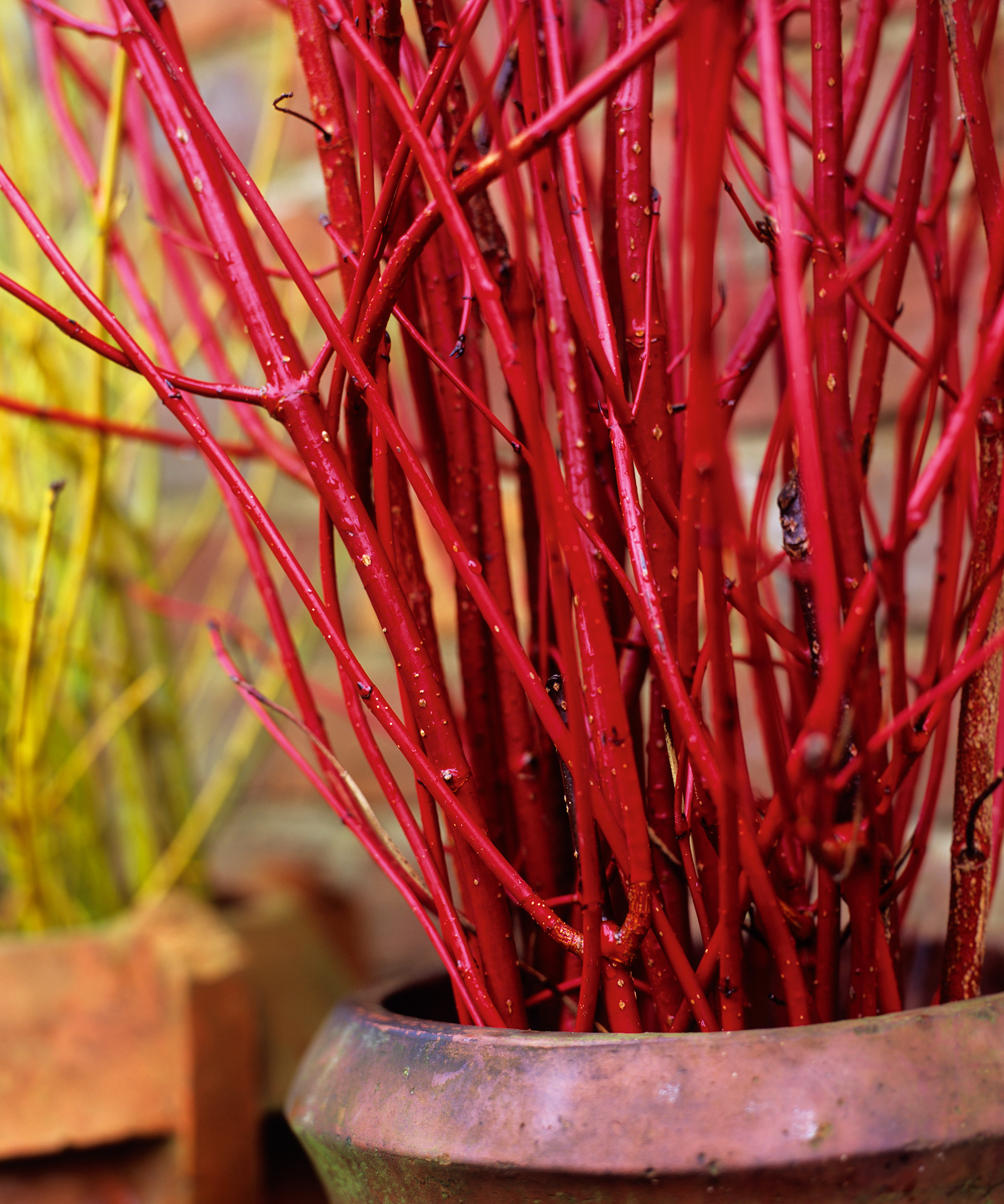 Mit seinen auffälligen roten Zweigen ist der rote Hartriegel (Cornus sericea) eine eher ungewöhnliche Wahl, die den Wow-Faktor von Weihnachtsblumentöpfen auf der Veranda erhöht.