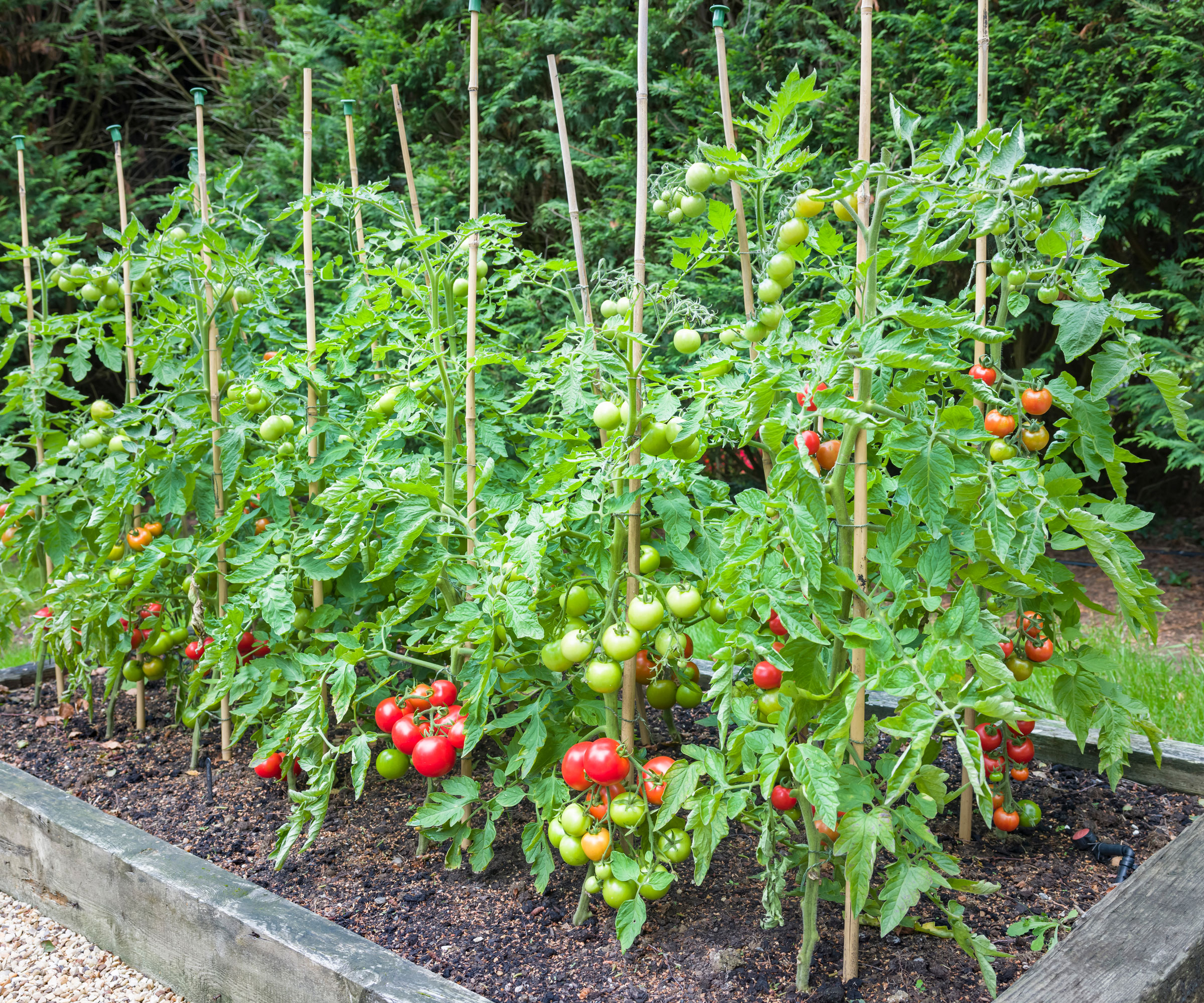 Bei längeren Reihen von Tomaten und Paprika sollten Sie die „Pfähle und Schnüre”-Methode in Betracht ziehen. Schlagen Sie zunächst einen hohen Pfahl zwischen jede zweite Pflanze, solange die Pflanzen noch klein sind. Wenn die Pflanzen 30 cm hoch sind, spannen Sie die erste Schnur zwischen den Pfählen in einer Höhe von 25 cm über dem Boden und wickeln Sie die Schnur einmal um jeden Pfahl. Die Pflanzen werden zwischen den beiden Schnüren, die auf beiden Seiten der Pfähle gespannt sind, aufrecht gehalten.