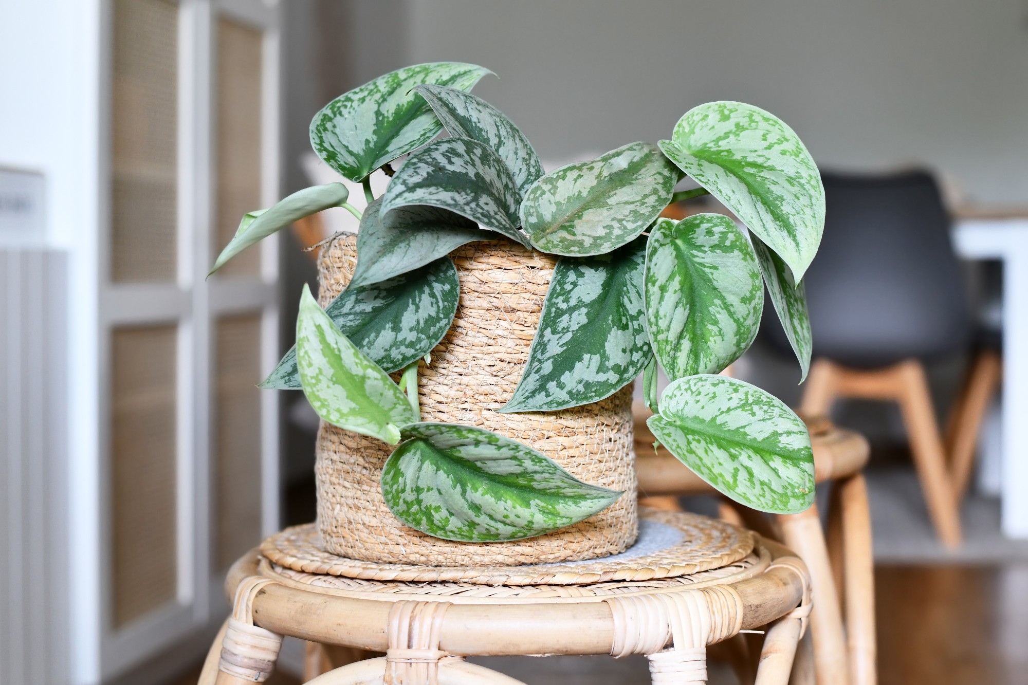 Mit seinen herzförmigen, mattgrünen Blättern, die mit schillernden silbernen Flecken übersät sind, sieht der Satin Pothos aus, als gehöre er in einen hochwertigen botanischen Garten, doch er ist etwa so anspruchsvoll wie ein gewöhnlicher Pothos.