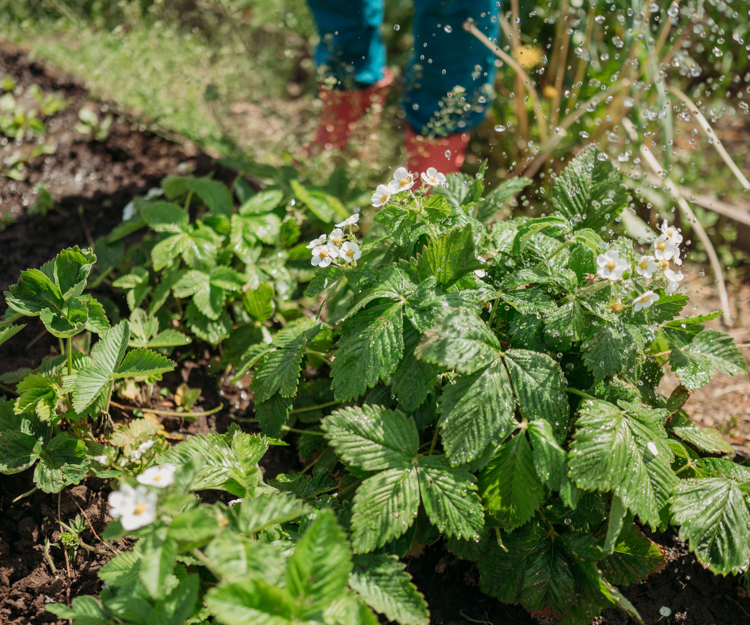 Wenn Sie Containerpflanzen kaufen, müssen diese in der gleichen Tiefe in den Boden des Hochbeets gepflanzt werden, in der sie im Containermedium standen. Wenn die Erdbeerpflanzen zu tief eingesetzt werden, kann die Spitze, aus der die Pflanze wächst, verfaulen. Drücken Sie die Erde um das Medium der Containerpflanze herum fest, um Lufteinschlüsse im Boden zu vermeiden.