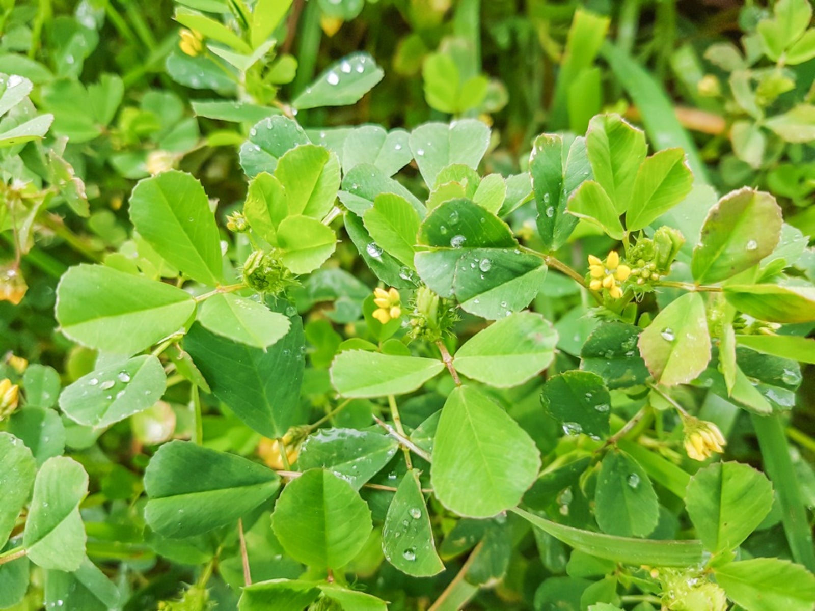 Klettenlabkraut (Medicago polymorpha), auch bekannt als Klettenkraut, ist eine dreiteilige Unkrautart, die sich schnell im Rasen und Garten ausbreiten kann, wenn sie nicht bekämpft wird. Sie erkennen dieses Unkraut an seinen grünen, gezackten Blättern und den rotvioletten Stielen, die dicht am Boden entlangkriechen. Es hat auch kleine gelbe Blüten. Nach der Blüte bilden die winzigen grünen Hülsen stachelige Kletten. Diese trocknen schließlich aus, verfärben sich braun und verbreiten ihre Samen überall. Burr Medic keimt im Herbst und Winter und blüht im Frühjahr.