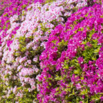 In einem anderen Beet im Hinterhof habe ich mehrere Taglilien mit grünem Laub, die jedoch alle unterschiedliche Farben haben – Rosa, Dunkelviolett, Pink, Lachsrosa und Cranberry. Zwei Zwerghortensien blühen weiß und verblassen zu Rosa. Sie harmonieren mit einer rosa Gartenphlox und einem magentafarbenen Schmetterlingsstrauch. Die Herbstfreude-Fetthenne blüht rosa und verblasst zu einem dunkleren Rosa, sodass sie sich gut in das grüne Laub und die Rosatöne im Beet einfügt.
