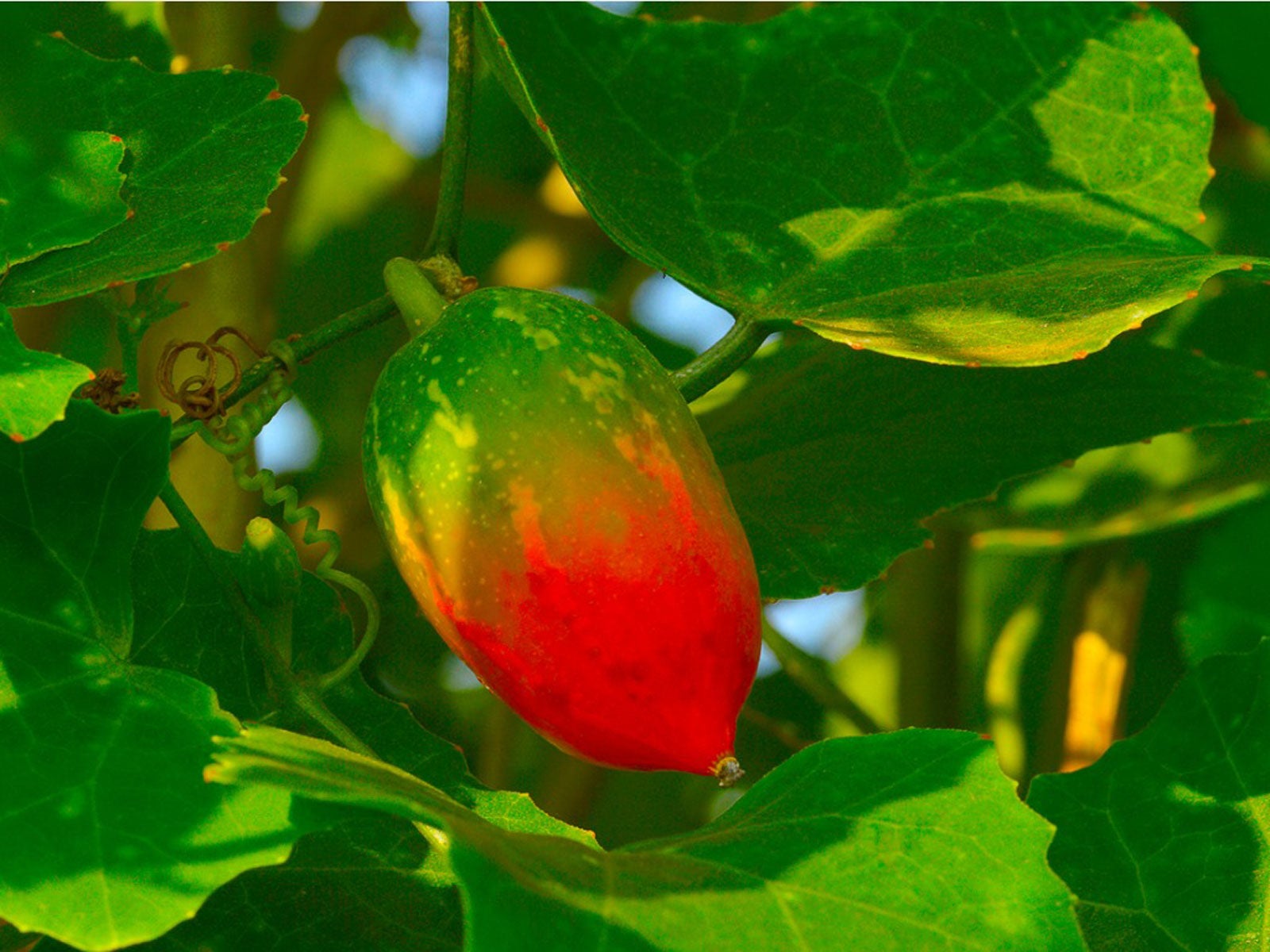 Die scharlachrote Efeukürbisrebe stammt aus den tropischen Regionen Afrikas, Asiens und Australiens und gehört zur Familie der Cucurbitaceae. Sie ist mit Gurken, Kürbissen, Zucchini und Melonen verwandt. Sie hat viele Namen in verschiedenen Sprachen, aber im Englischen wird sie auch „Baby-Wassermelone” genannt. Dieser Spitzname kommt von dem wassermelonenähnlichen Aussehen der grünen, unreifen Frucht.
