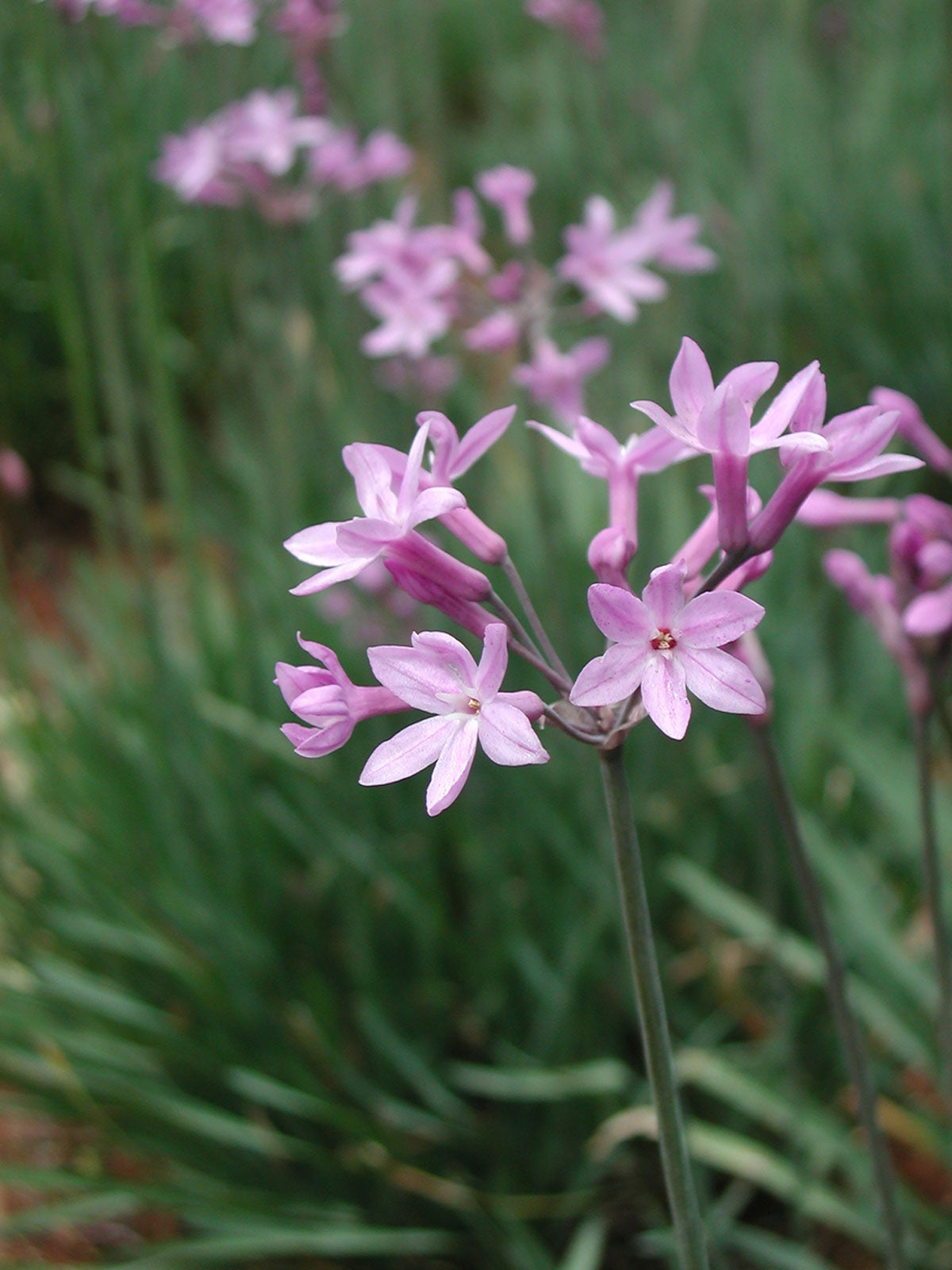 Die auffälligen Blüten wachsen in doldenartigen Büscheln an der Gesellschaftslauchpflanze (Tulbaghia violacea). Die Blüten der Gesellschaftslauchpflanze erscheinen von Frühsommer bis Herbst auf 30 cm hohen, grasartigen Stielen, was diese Pflanze zu einer begehrten Ergänzung für sonnige Blumenbeete macht.