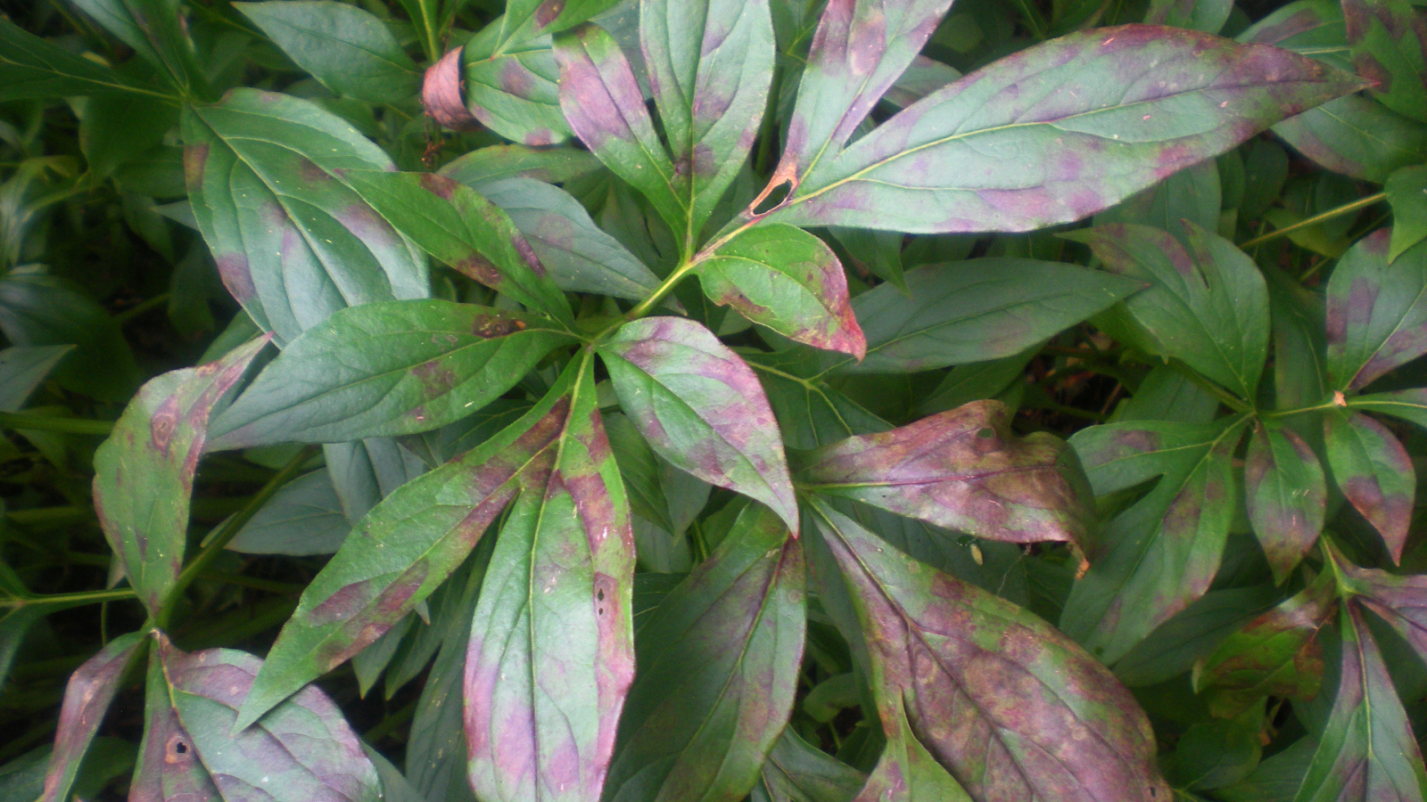 Blattflecken – Auch bekannt als Pfingstrosenmasern oder Pfingstrosenrote Flecken, handelt es sich hierbei um eine Pilzkrankheit, die durch den Erreger Cladosporium paeoniae verursacht wird. Symptome sind rote bis violette Flecken von mindestens 2,5 cm Durchmesser auf den Blättern, die in der Nähe der Flecken gekräuselt oder verdreht sein können. An den Stielen können sich rote Streifen bilden. Diese Krankheit tritt am häufigsten im mittleren bis späten Sommer auf.