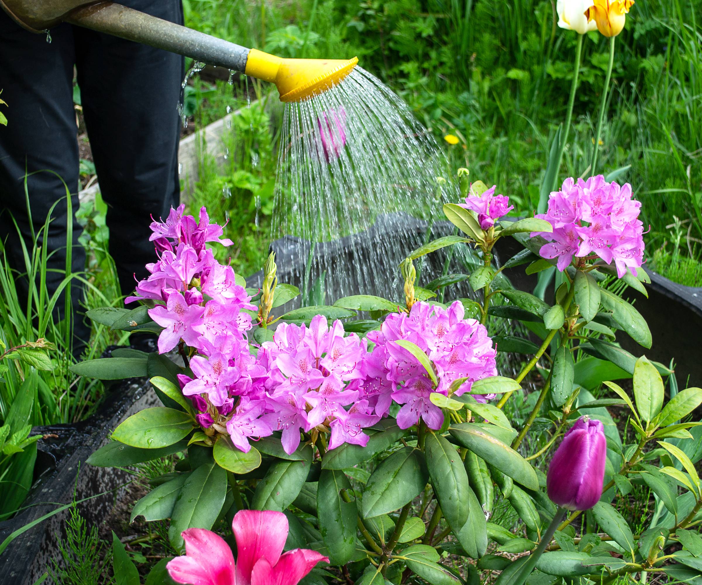 Rhododendren benötigen viel Wasser, bevor der Boden gefriert. Trockene Wurzeln reißen durch Frost-Tau-Zyklen. Geben Sie wöchentlich 2,5 bis 5 cm Wasser, bis der Boden hart wird. Verwenden Sie einen Tropfschlauch auf niedriger Stufe für etwa zwei Stunden. Befeuchten Sie den Boden bis zu einer Tiefe von 30 cm. Testen Sie mit einem Schraubenzieher – wenn er leicht hineingleitet, ist alles in Ordnung.