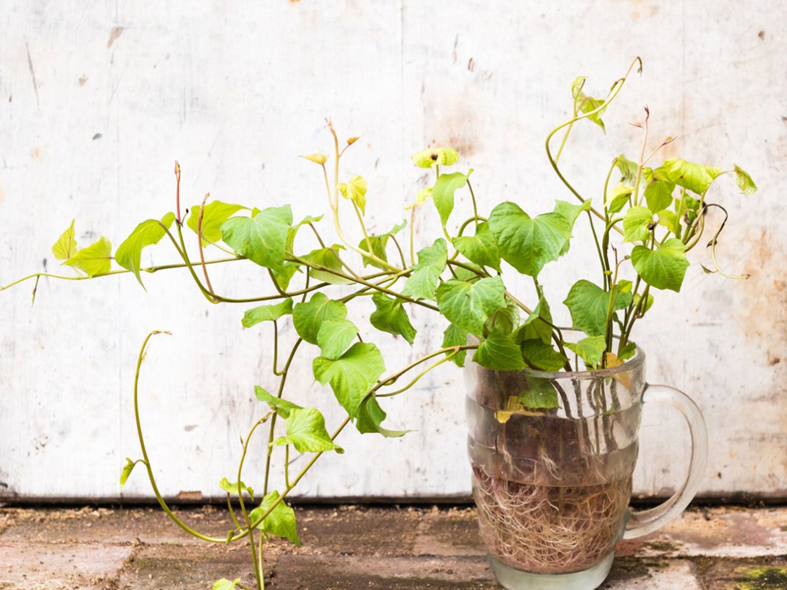 In beiden Fällen ist es Zeit für den nächsten Schritt, sobald die Sprossen eine Länge von 13 bis 15 cm erreicht haben. Entfernen Sie die Sprossen vorsichtig von der Süßkartoffel, indem Sie sie abdrehen oder abschneiden. Entfernen Sie die unteren Blätter vom Spross und stellen Sie den teilweise entblätterten Spross in Wasser an einen warmen Ort mit viel Sonnenlicht oder einer Wachstumslampe. Füllen Sie nach Bedarf Wasser nach.