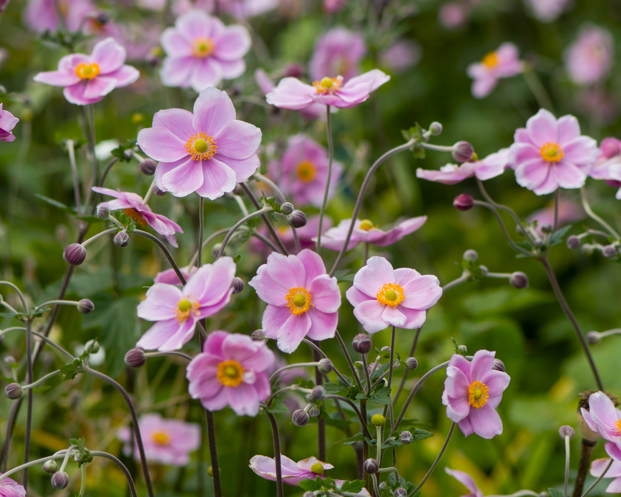 Japanische Anemonen bilden kleine, gänseblümchenähnliche Blüten an drahtigen Stielen. Diese Blüten gibt es in Weiß und verschiedenen Rosa- und Violetttönen.