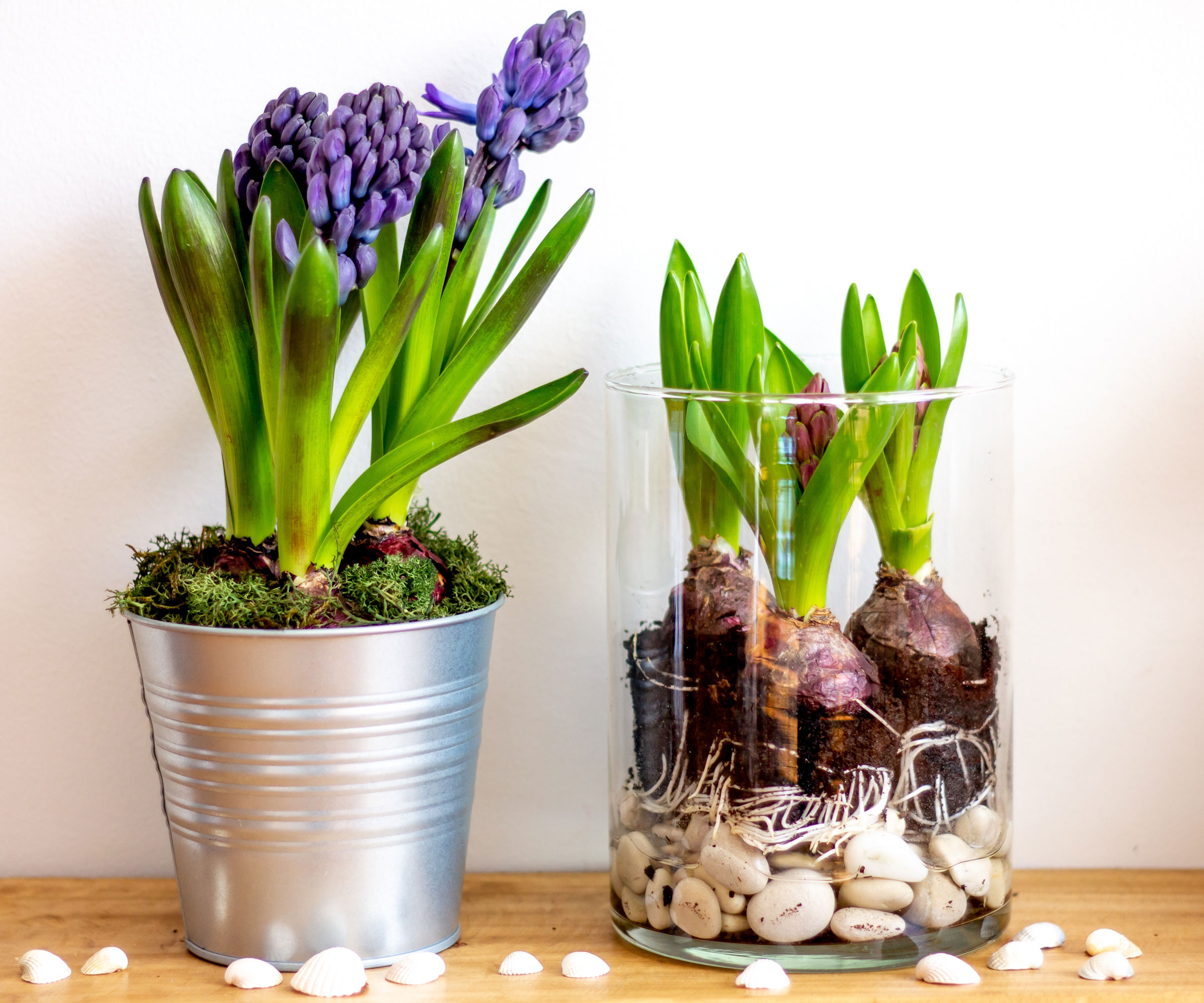 Hemligheten bakom en spektakulär inomhusutställning börjar långt innan den första grodden dyker upp. När du väljer lökar, leta efter sådana som är friska, fylliga, fasta och tunga för sin storlek. Tänk på lökarna som batterier, där all energi för blomningen redan finns lagrad. Ju större och friskare löken är, desto mer energi har den för blomningen. Djupblåa hyacinter av sorten ”Blue Star” och mjukrosa hyacinter av sorten ”Fondant” är pålitliga klassiker för inomhusodling, liksom hyacintlökar av sorten ”Blue Jacket”. Alla dessa finns att köpa på Amazon.