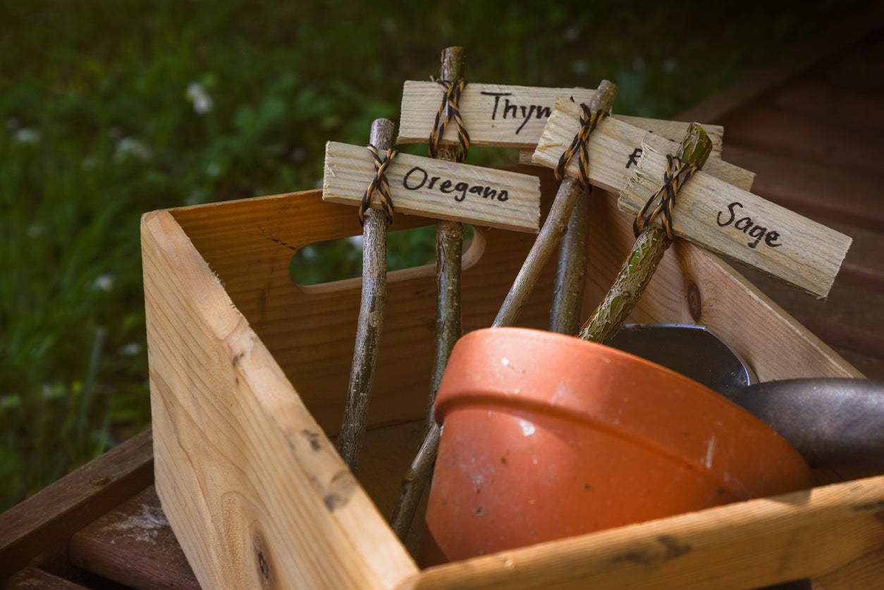 - Träskedar. Ta en tur till din lokala secondhandbutik och köp olika träskedar. Skriv eller måla växtnamnen på skedens ände och stick ner dem i jorden.