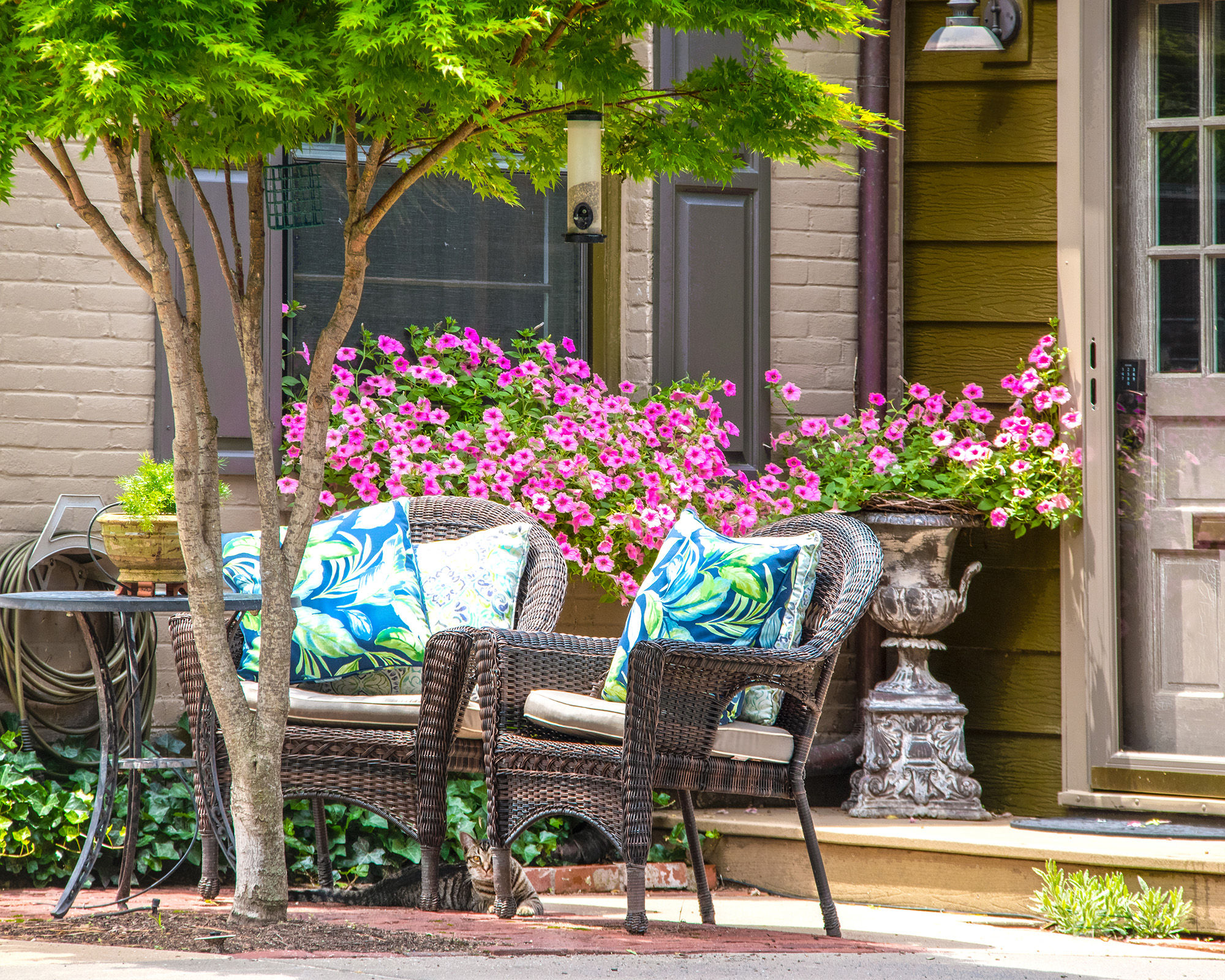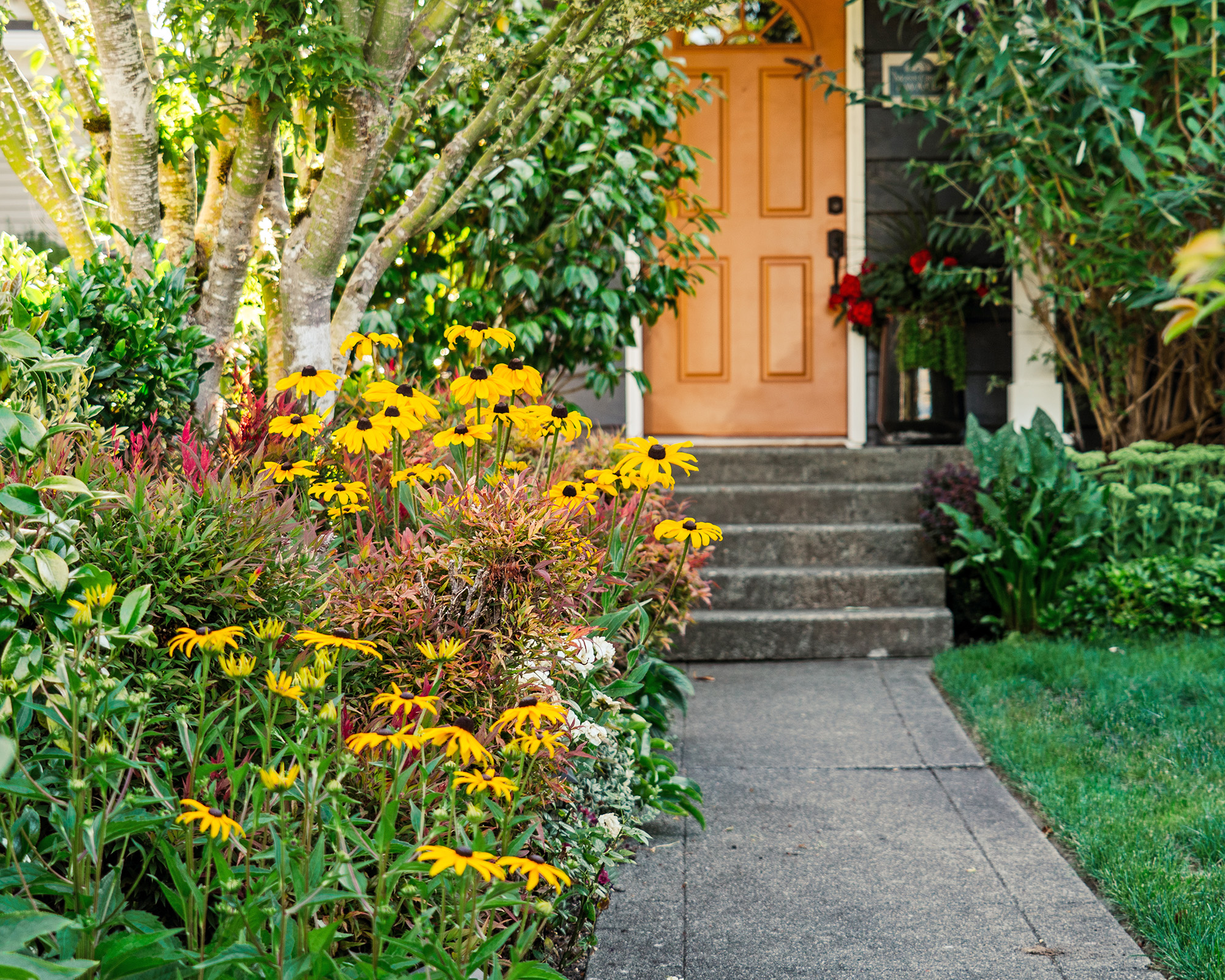 El color es una herramienta poderosa que tiene una gran influencia en la forma en que se percibe tu hogar. En un jardín delantero pequeño, una paleta de un solo color o complementaria funciona muy bien.