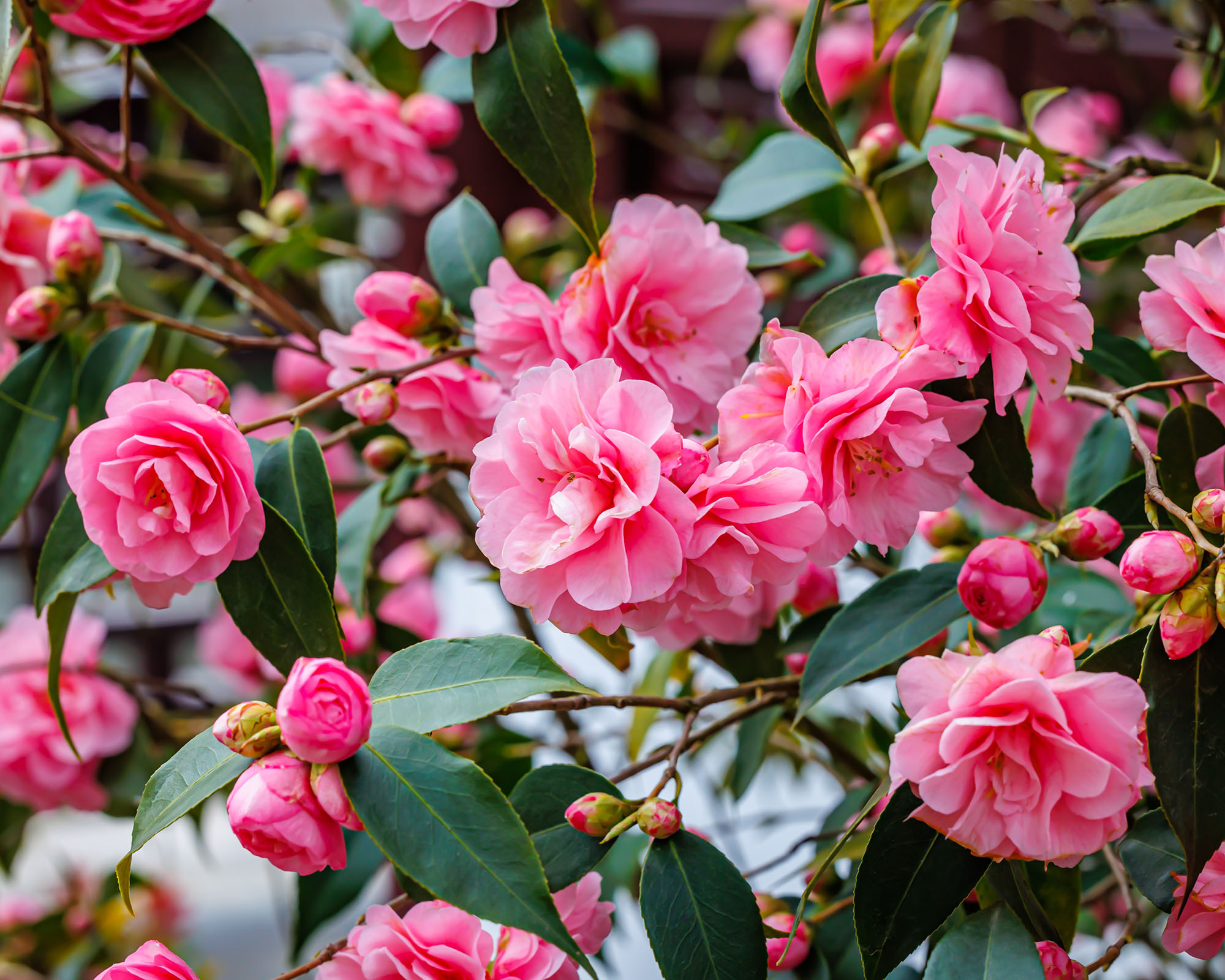 La camelia es un fabuloso arbusto de hoja perenne con hojas oscuras y brillantes que florece en primavera, o incluso en invierno en algunas zonas; la hortensia de hoja de roble proporciona una buena privacidad desde la primavera hasta el otoño con hermosas flores blancas; la buganvilla es una enredadera de flores coloridas para zonas más cálidas; mientras que el hibisco resistente produce continuamente flores grandes y vibrantes durante un largo período. Home Depot ofrece varios tipos de arbustos con flores.