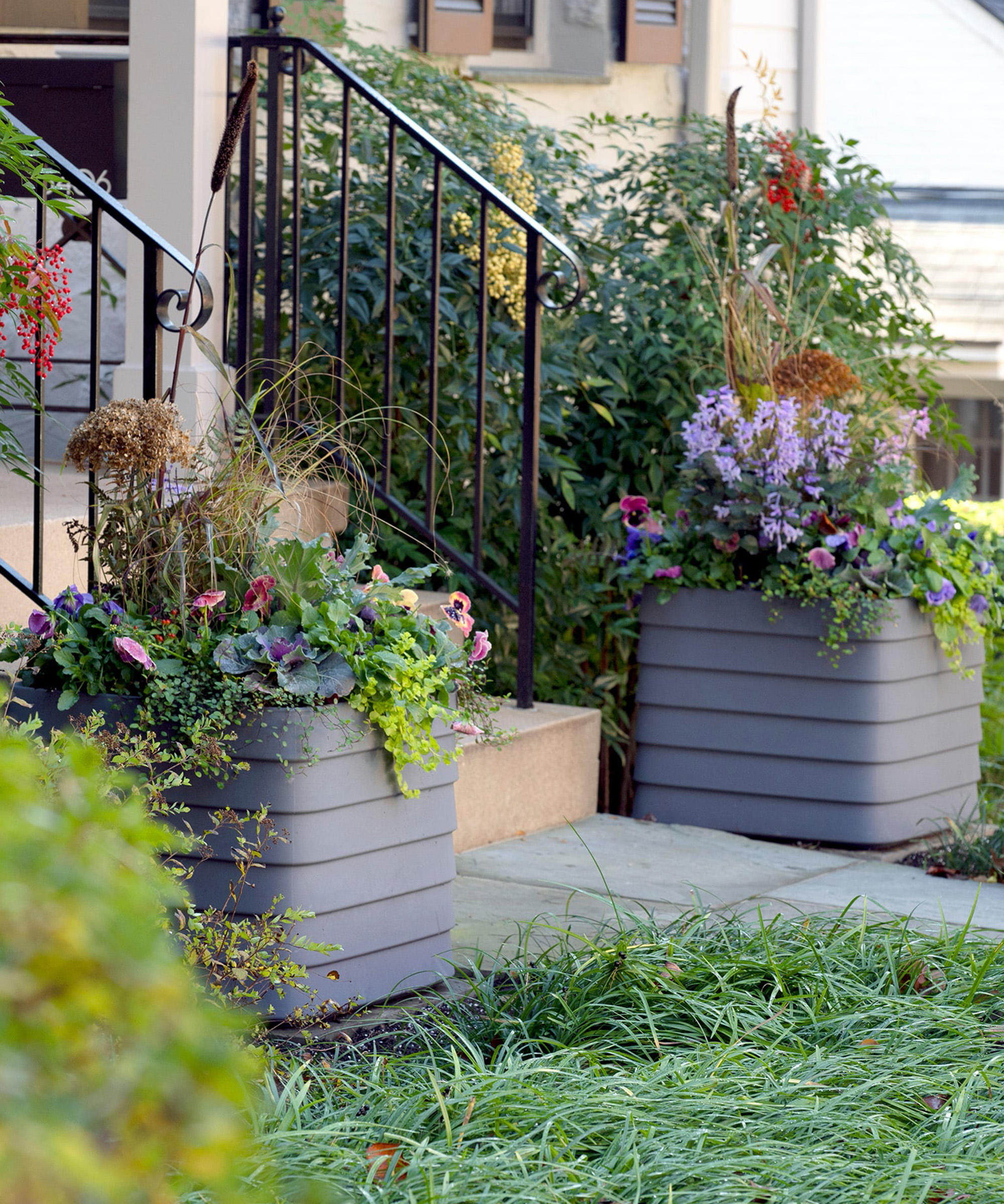 Además de añadir un punto focal atractivo al exterior de la casa, las jardineras son un ingenioso truco de paisajismo, ya que atraen la mirada hacia arriba, lo que ayuda a aumentar el tamaño percibido del jardín delantero.
