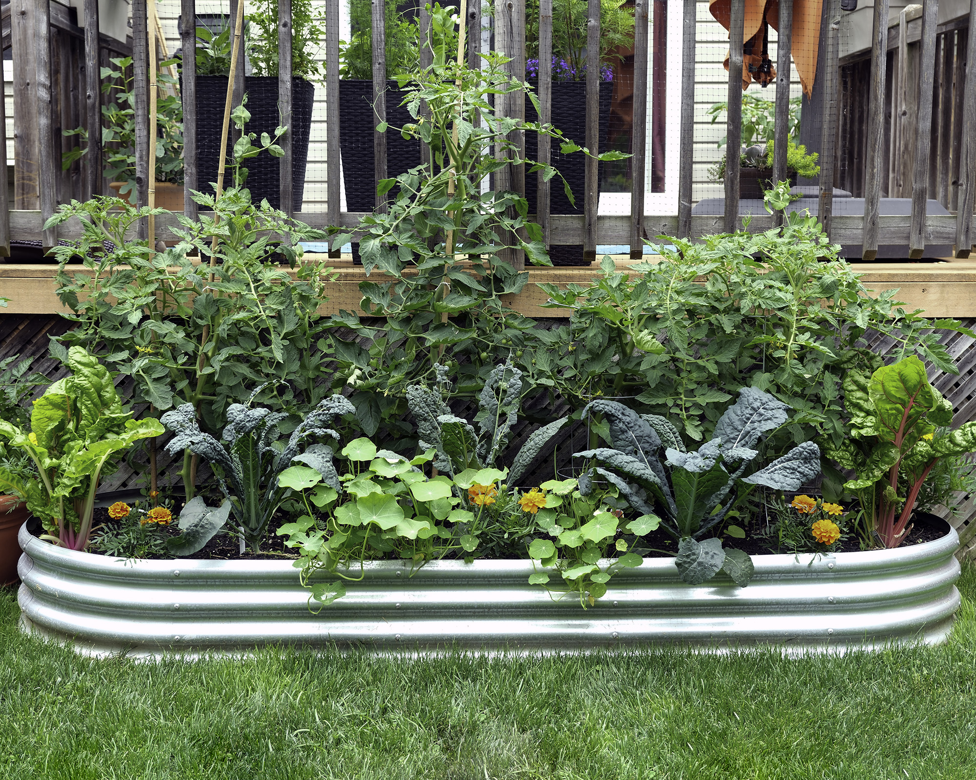 Invierte en una jardinera metálica elevada para contener tu huerto y crear un elemento decorativo elegante. Mezcla algunas flores complementarias bonitas, como caléndulas y capuchinas, para ayudar a controlar las plagas.