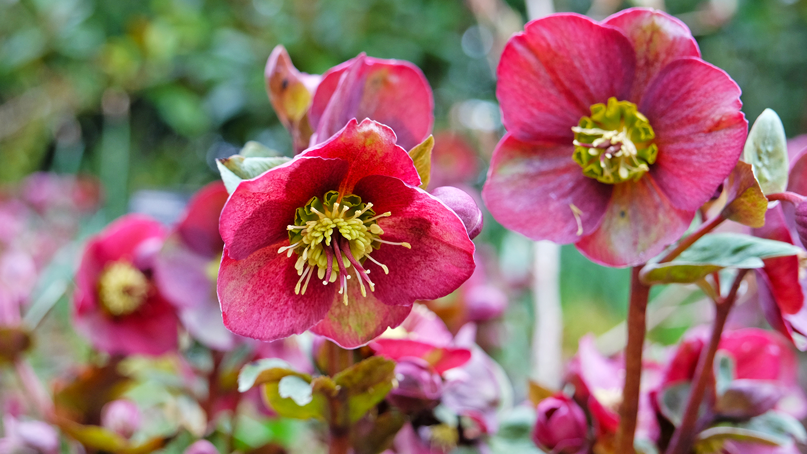 El eléboro, una de las primeras plantas perennes en florecer, florece en primavera o, en climas más cálidos, en invierno. Este último hábito es la razón por la que también se le llama rosa de Cuaresma. El eléboro es apreciado por sus flores tempranas en tonos blancos, amarillos, morados y rosados. Incluso se pueden encontrar variedades, como «Dark and Handsome», disponible en Burpee, con flores casi negras. También tienen un follaje atractivo que forma una bonita cubierta vegetal cuando las plantas no están en flor.