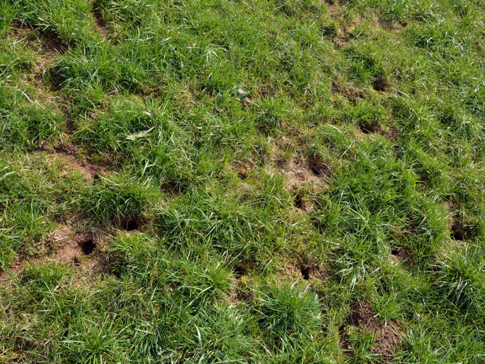 Los agujeros de los topos están cubiertos por un montículo de tierra, mientras que los de los topillos no. Las aves hacen agujeros en el césped mientras buscan comida y las lombrices hacen pequeños agujeros del tamaño de un lápiz para airear el suelo y proporcionar aire a sus túneles. Algunas avispas y otros insectos ponen huevos en el césped, lo que produce agujeros.