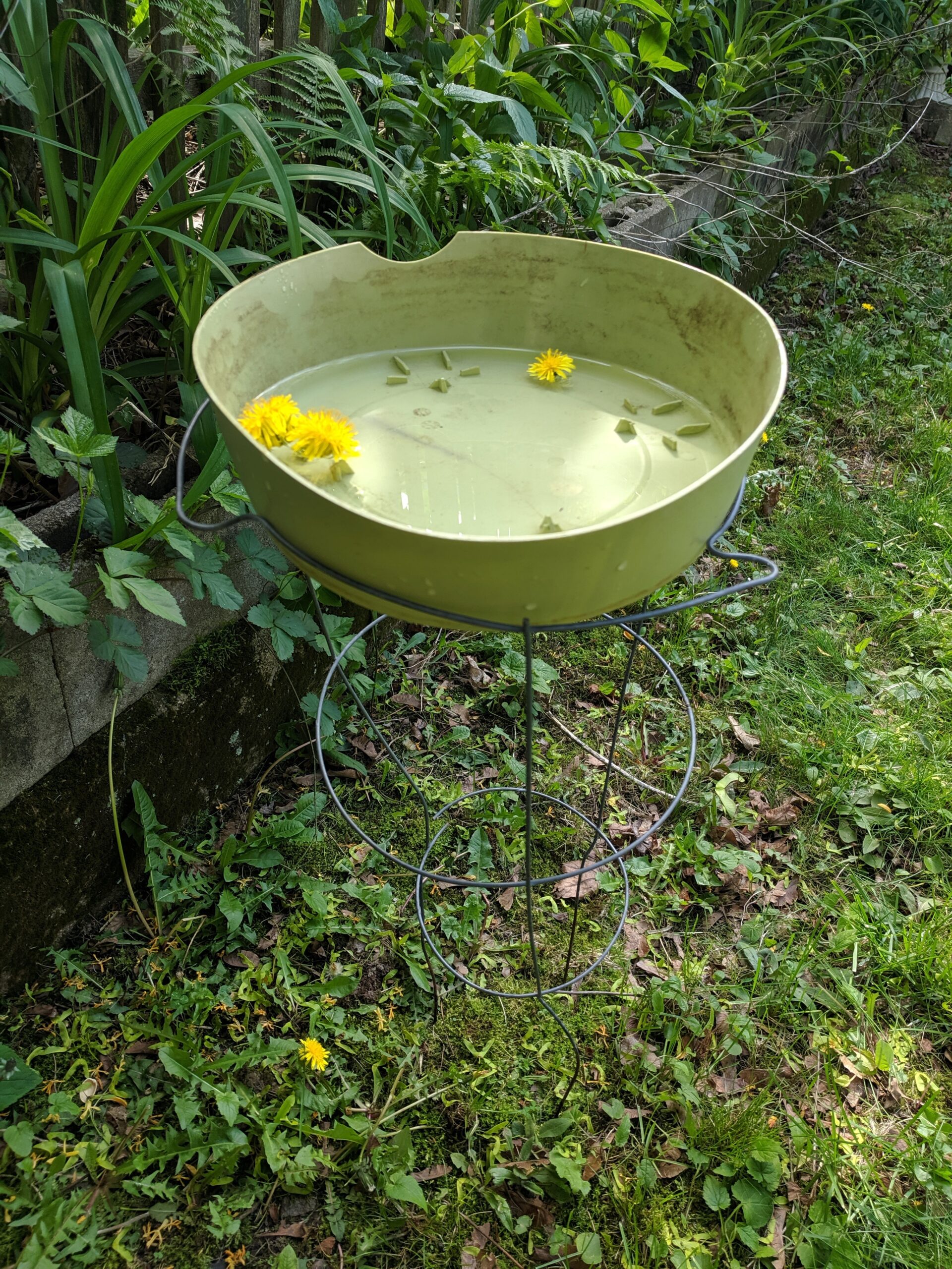 La base de tu bañera flotante para pájaros también es fácil de hacer. Una jaula para tomates clavada en el suelo es la base perfecta. Elige una que se ajuste al tamaño de tu platillo y simplemente colócalo sobre la jaula y listo. Si los tamaños no coinciden, es posible que tengas que utilizar un pegamento fuerte para adherir el plato a la jaula.