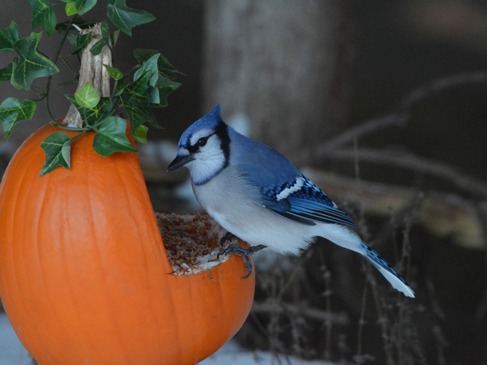 Muchas aves migran activamente hacia el sur en otoño, alrededor de Halloween y después. Si te encuentras en la ruta sur de su trayecto hacia su hogar invernal, quizá quieras ofrecerles un regalo de temporada, como usar una calabaza como comedero para pájaros.