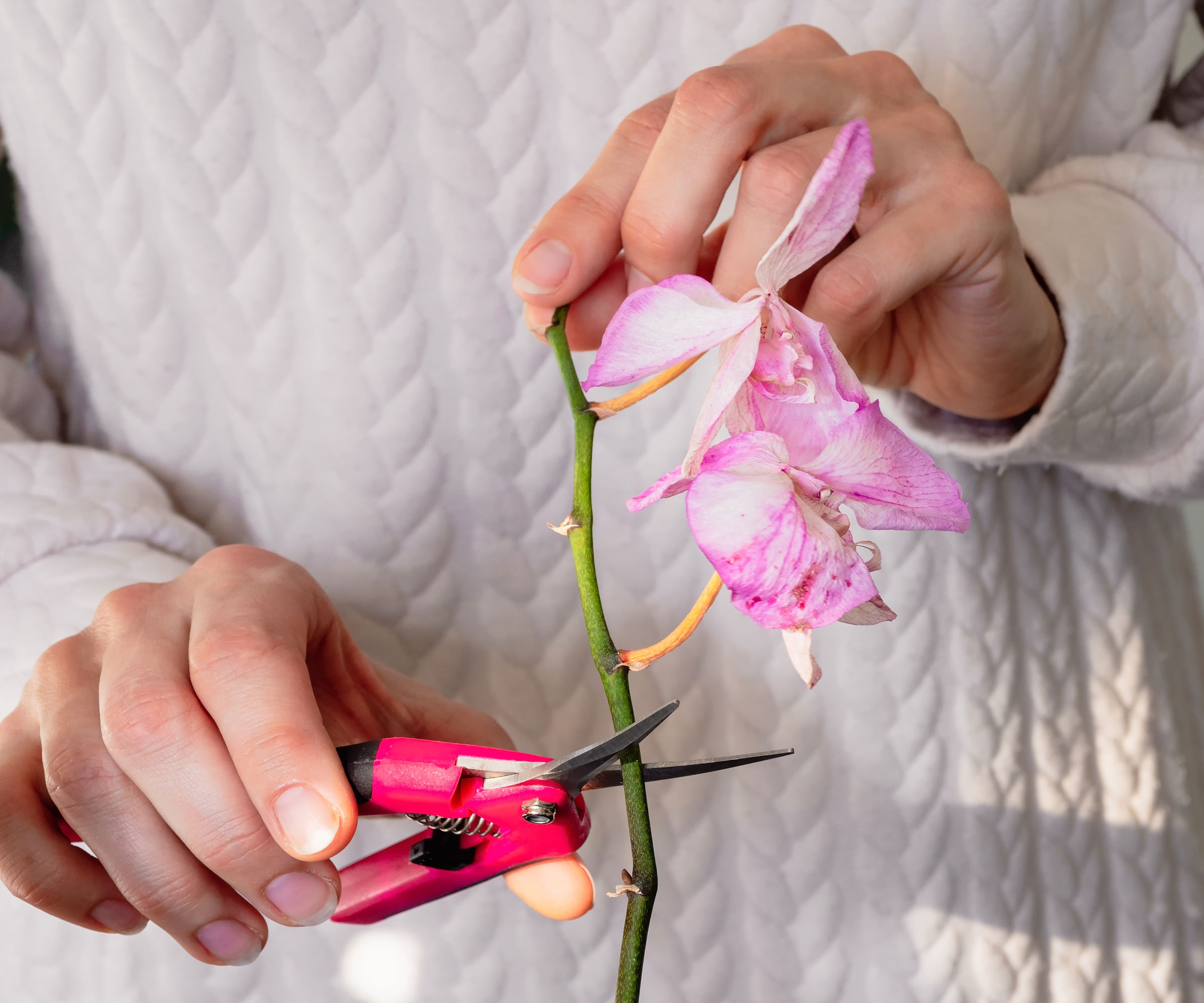 Las orquídeas se cultivan en condiciones muy cuidadas y estériles. Es importante minimizar la transmisión de enfermedades y evitar realizar cortes irregulares que puedan permitir la entrada de patógenos. Asegúrese de disponer de tijeras o podadoras muy afiladas para utilizar con su orquídea. Cuanto más afiladas estén las tijeras, más limpio será el corte. Un corte limpio contribuye a que la orquídea esté más sana.