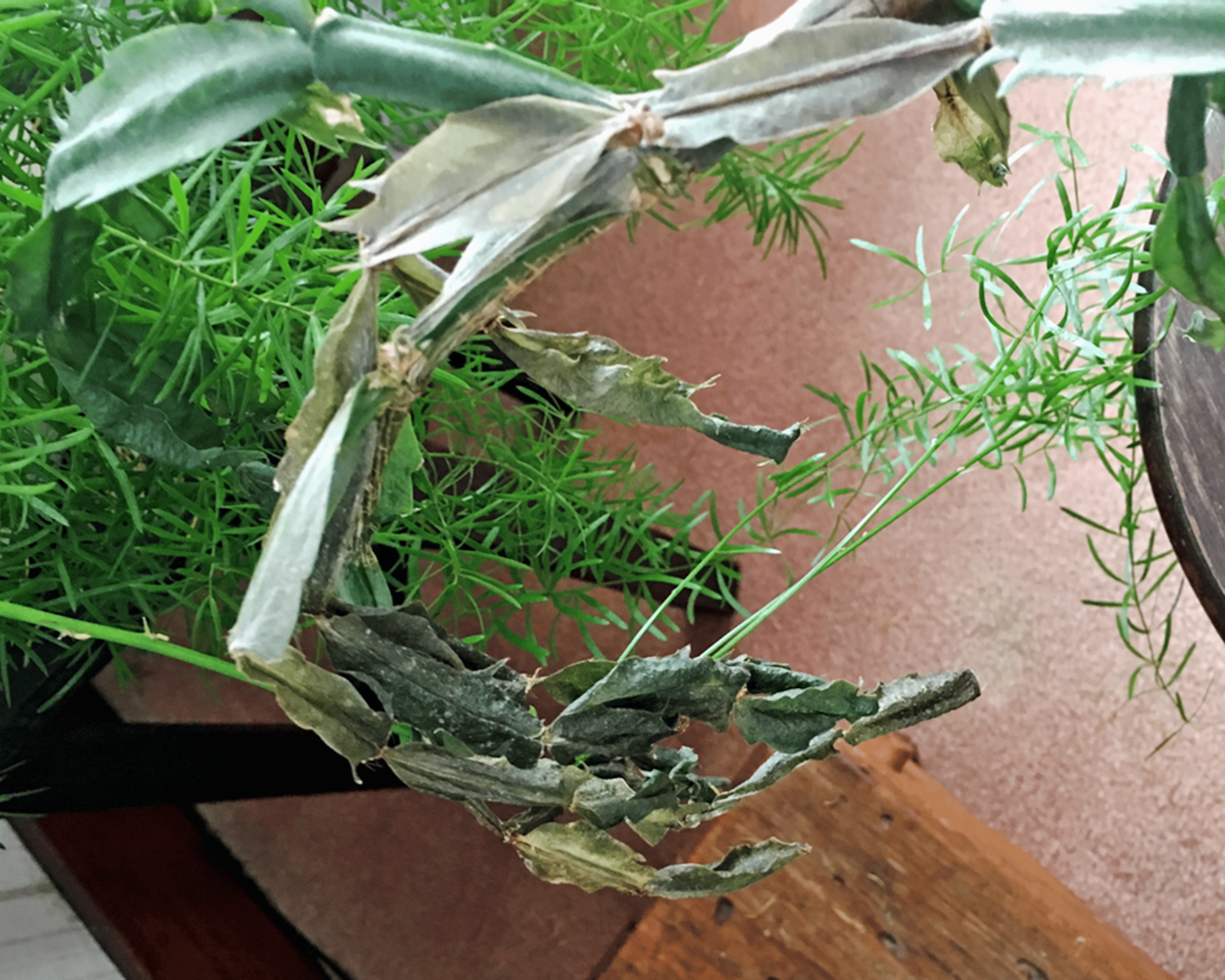 Un cactus de Navidad flácido también puede deberse a la falta de agua. Los propietarios suelen asumir que son verdaderos cactus que pueden tolerar condiciones de sequía. Esto no es cierto. La falta de agua y humedad puede hacer que los tallos y las hojas se caigan.
